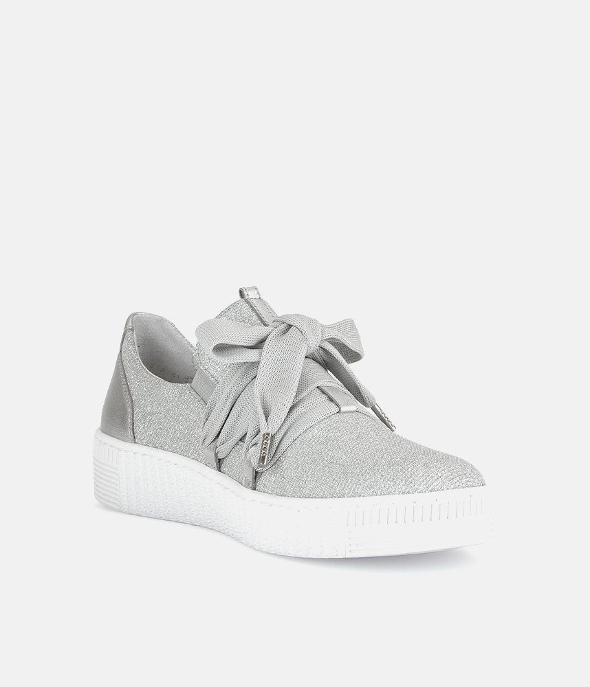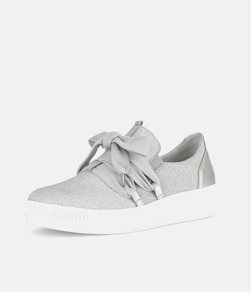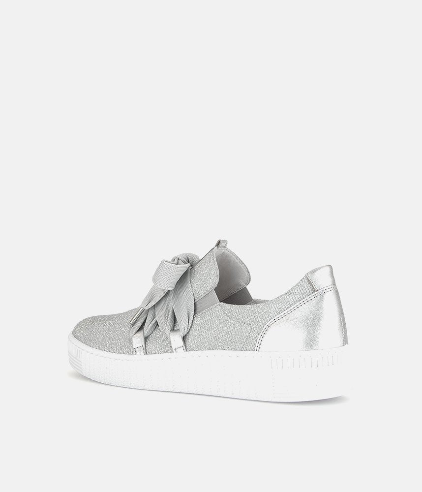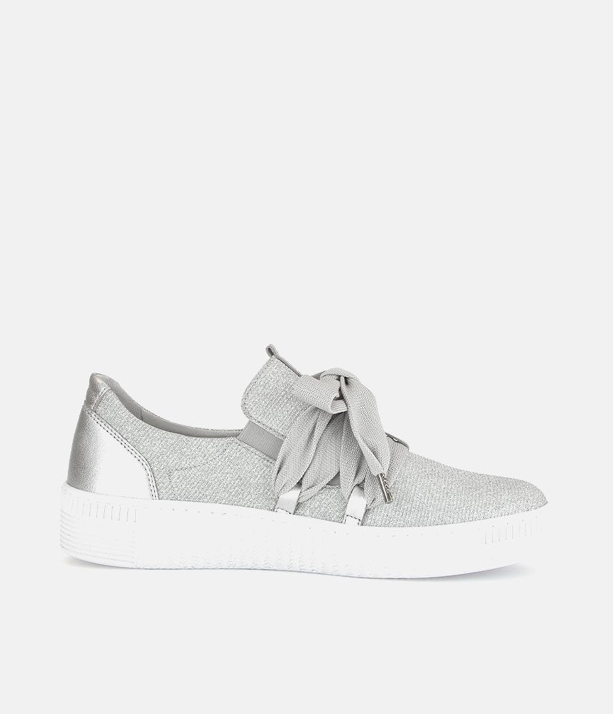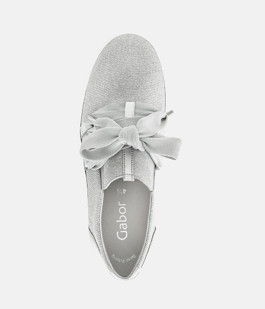 A Stylish Silver Slip on Style from Gabor with a chunky outsole featuring stylised grooving for a textured finish. A fantastic versatile style to have in your wardrobe that can be worn with a wide variety of looks and outfits. The trainers are lined with smooth leather and textile that cushions feet for a comfortable fit.