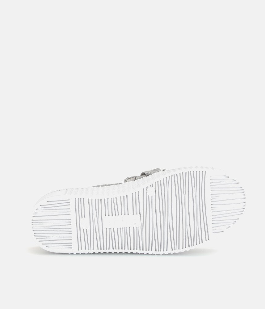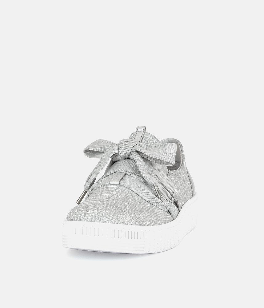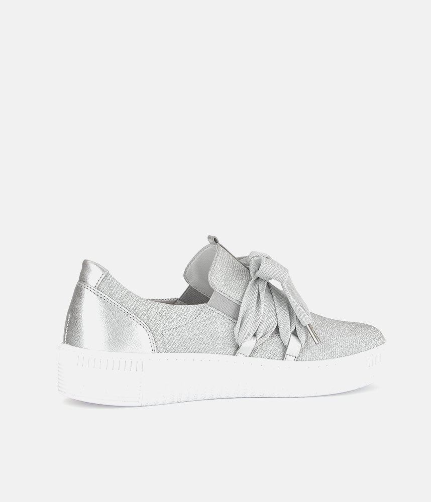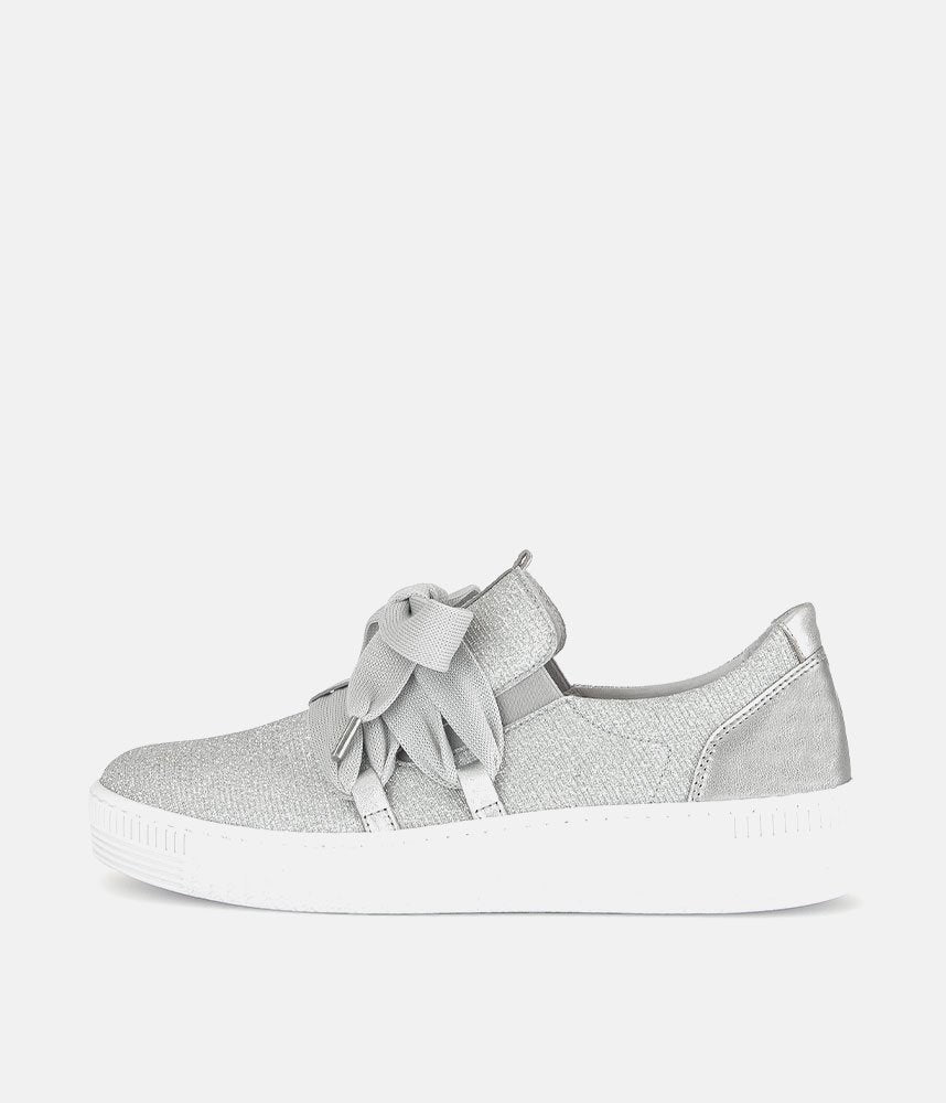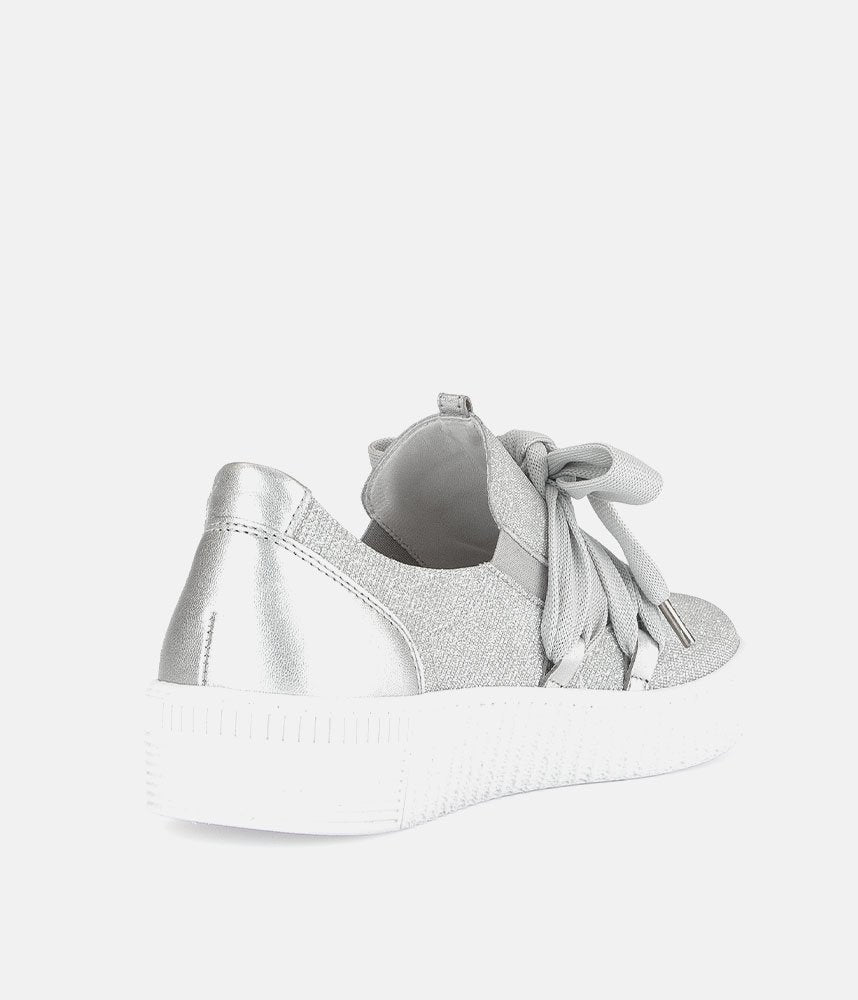 A Stylish Silver Slip on Style from Gabor with a chunky outsole featuring stylised grooving for a textured finish. A fantastic versatile style to have in your wardrobe that can be worn with a wide variety of looks and outfits. The trainers are lined with smooth leather and textile that cushions feet for a comfortable fit.