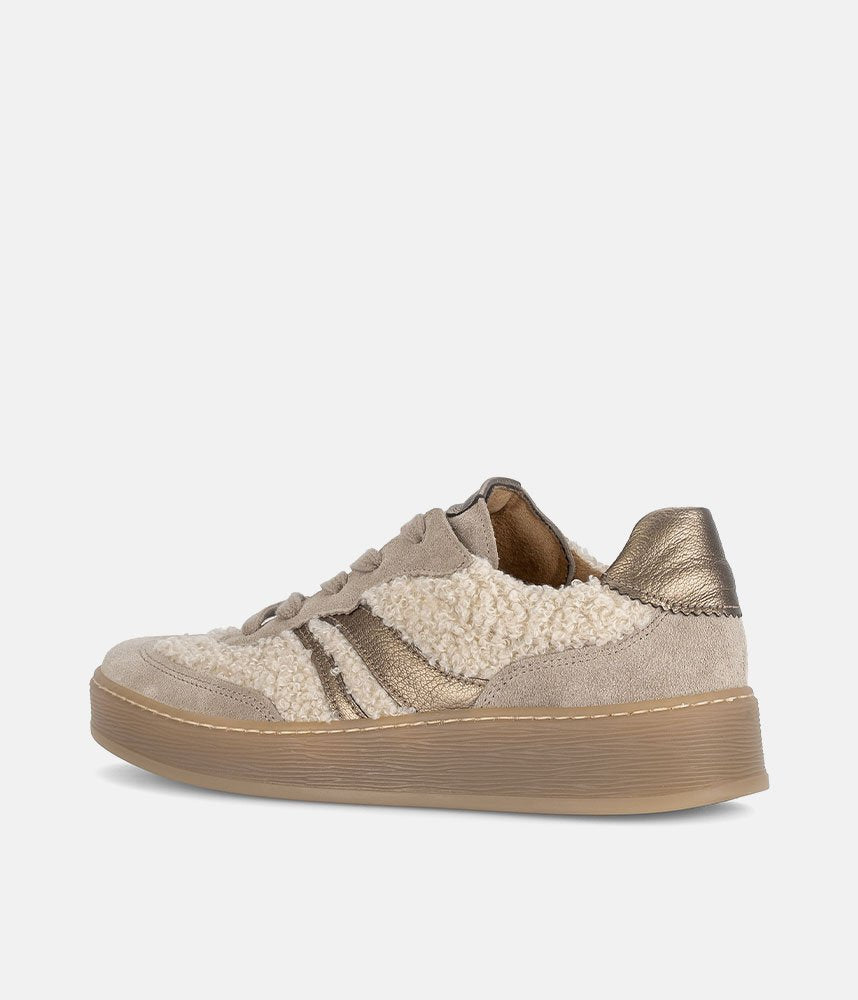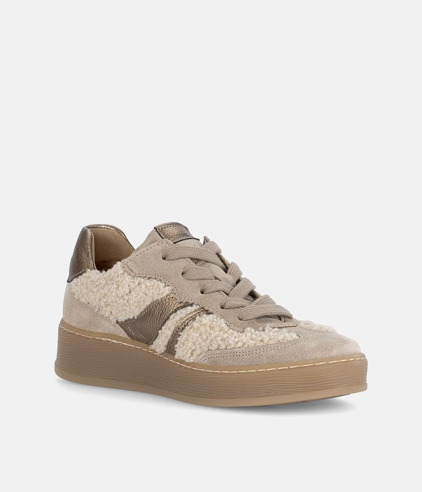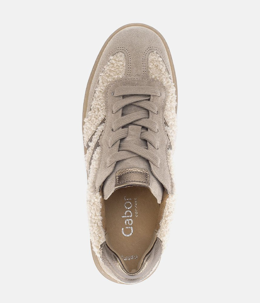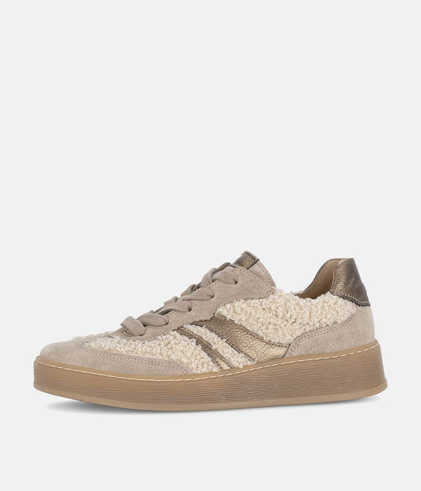Make a cozy and chic statement with these Gabor platform sneakers. Featuring a unique teddy-effect fabric, soft suede, and metallic gold stripes, they offer a blend of textures and colors. The comfortable chunky sole provides a stylish lift, while Gabor's signature comfort ensures all-day wear. Perfect for adding warmth and fashion to your casual look.