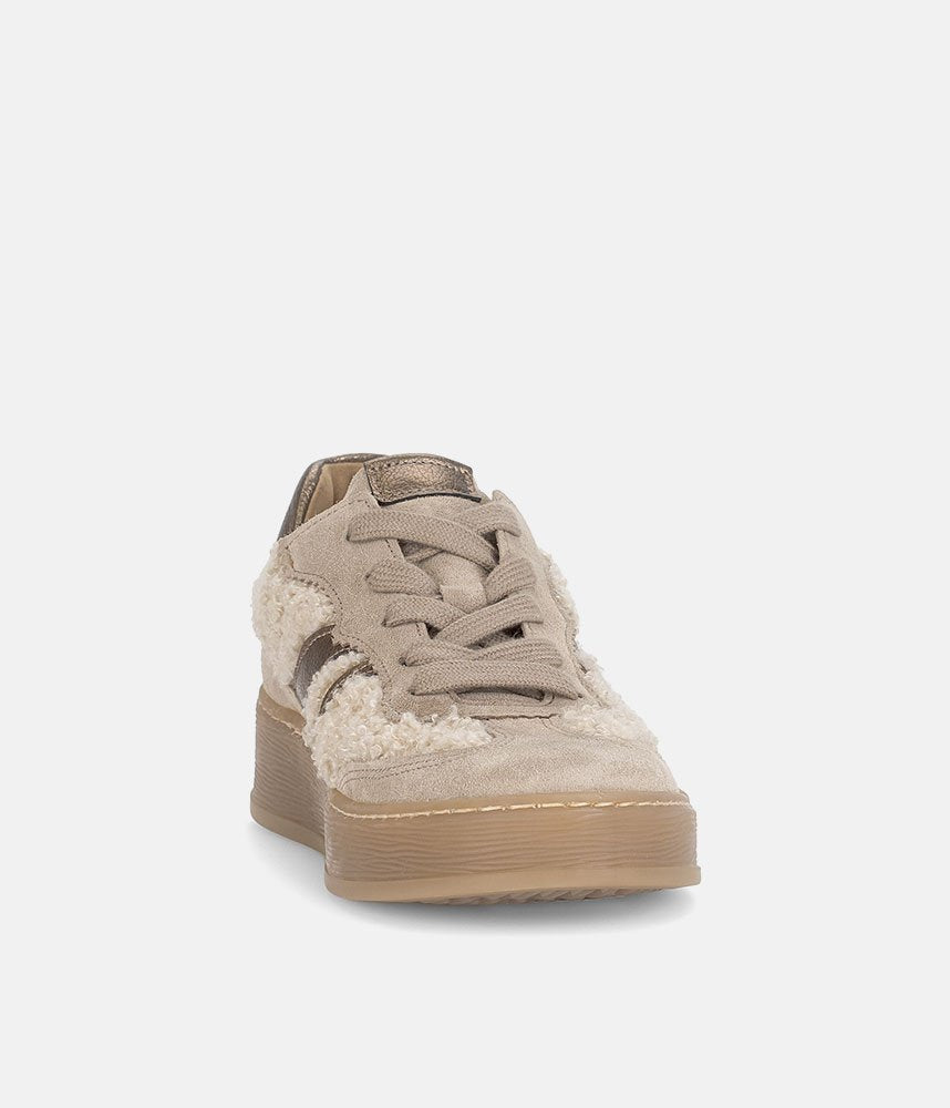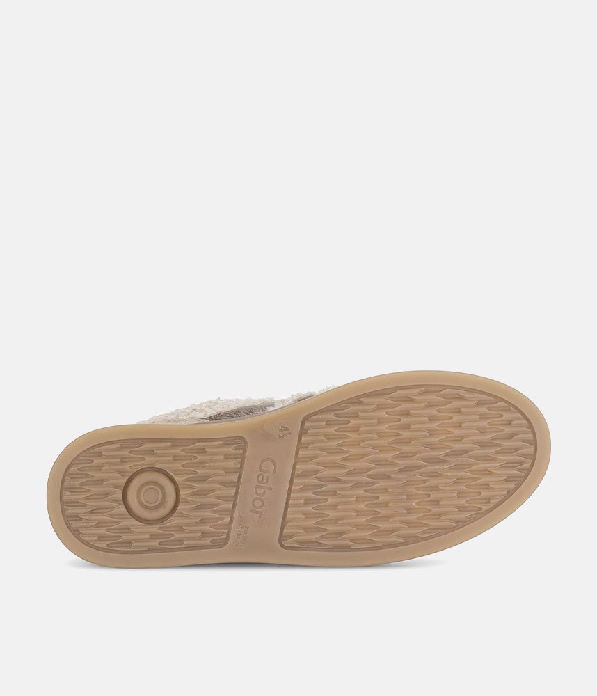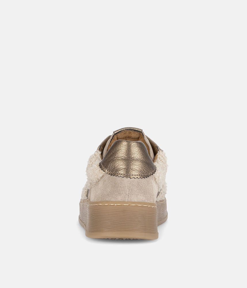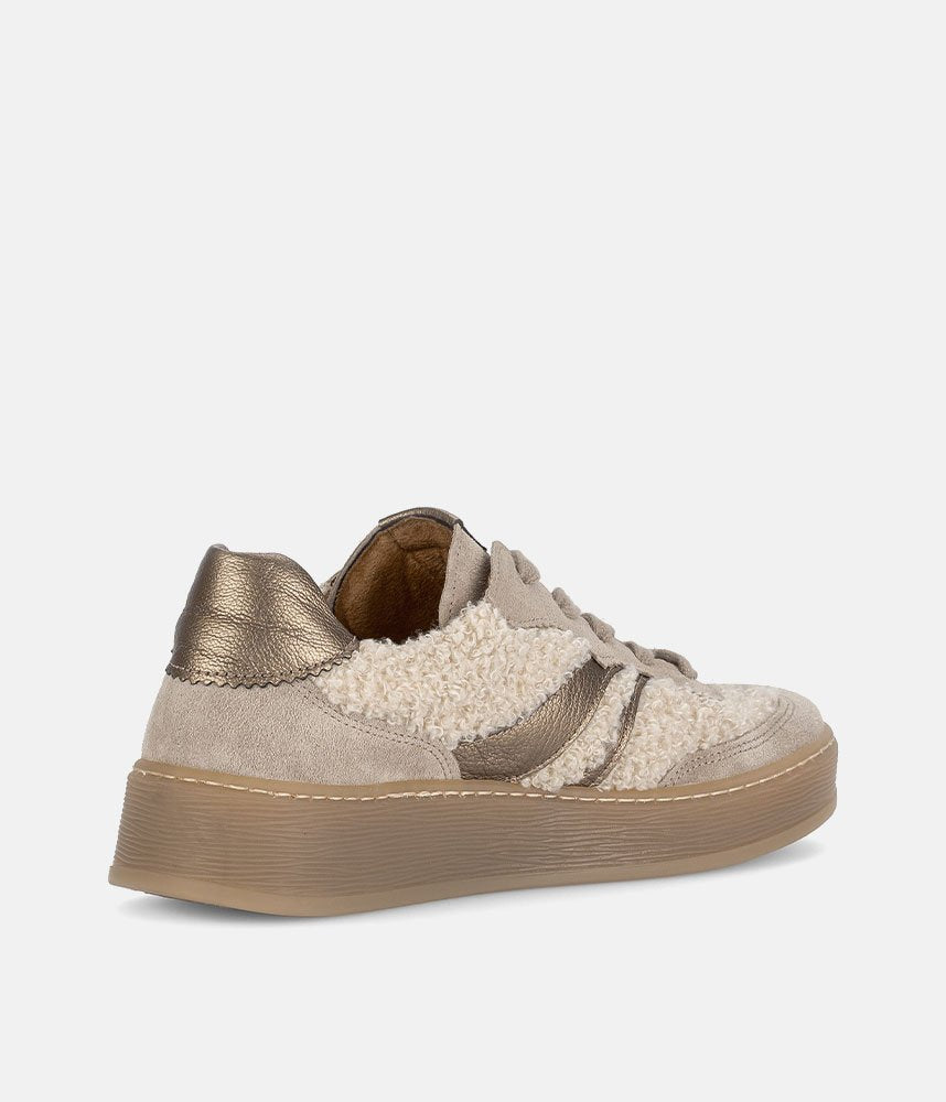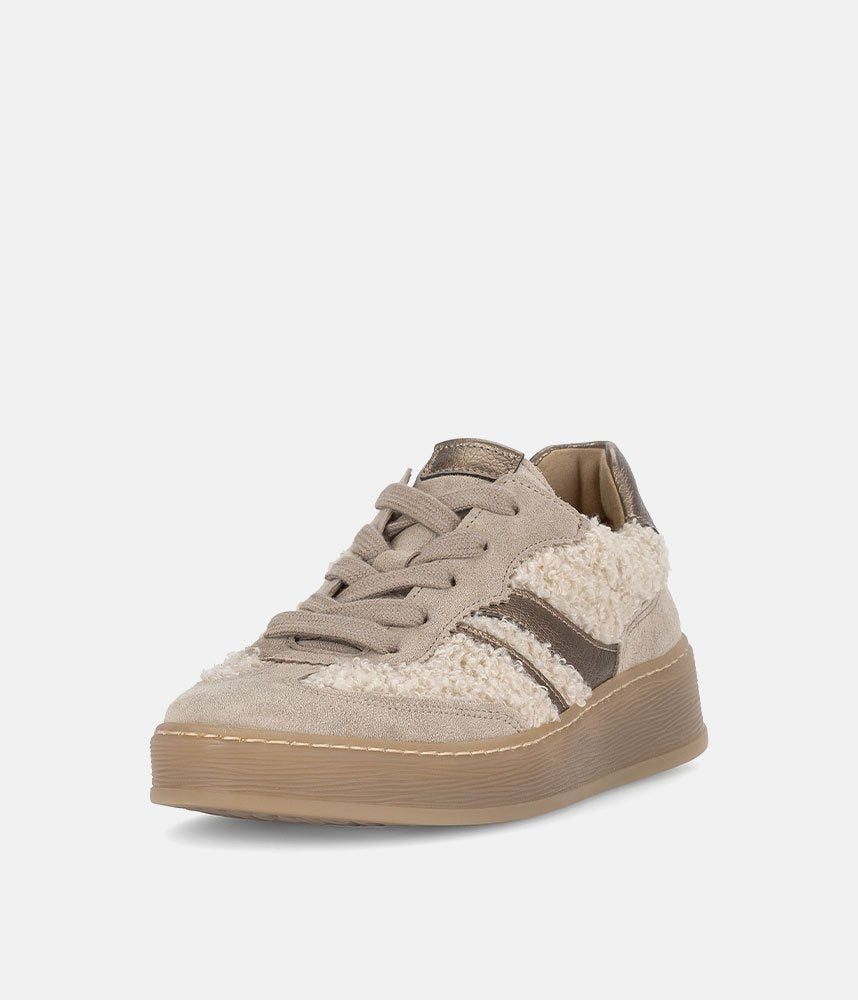 Make a cozy and chic statement with these Gabor platform sneakers. Featuring a unique teddy-effect fabric, soft suede, and metallic gold stripes, they offer a blend of textures and colors. The comfortable chunky sole provides a stylish lift, while Gabor's signature comfort ensures all-day wear. Perfect for adding warmth and fashion to your casual look.