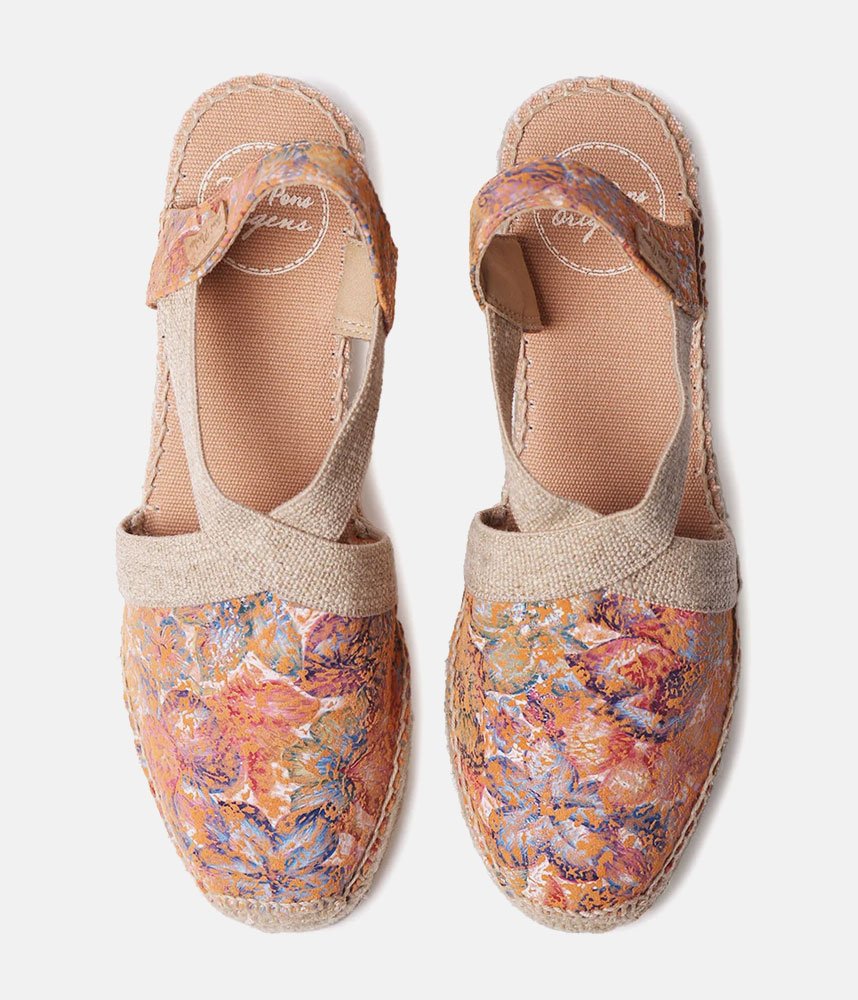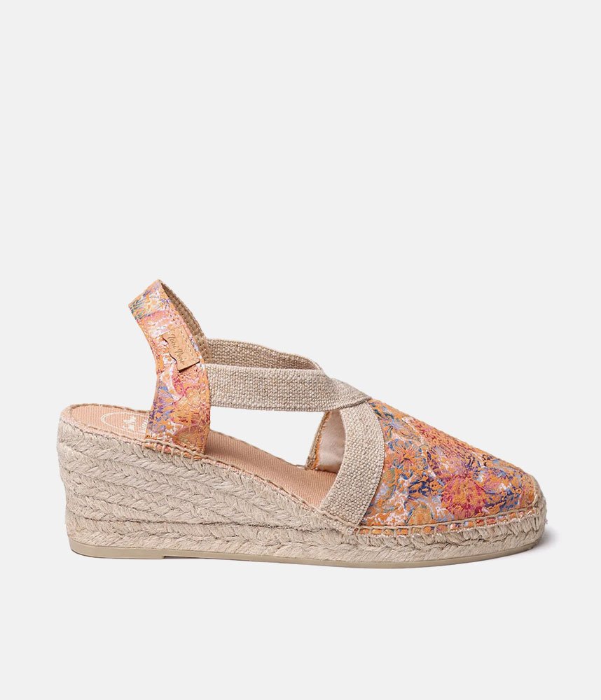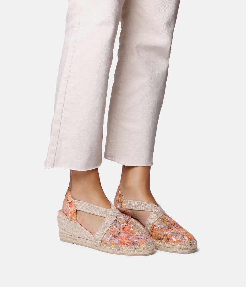 These Beautiful Toni Pons’ traditional espadrilles have been crafted from a beautiful colorful leather. Handstitched and featuring a 6 cm Jute wedge, including a 2 cm platform; this style also has two elasticated straps for an adjustable fit. The base of the sole is made of non-slip rubber and the inner insole is lined with fabric.