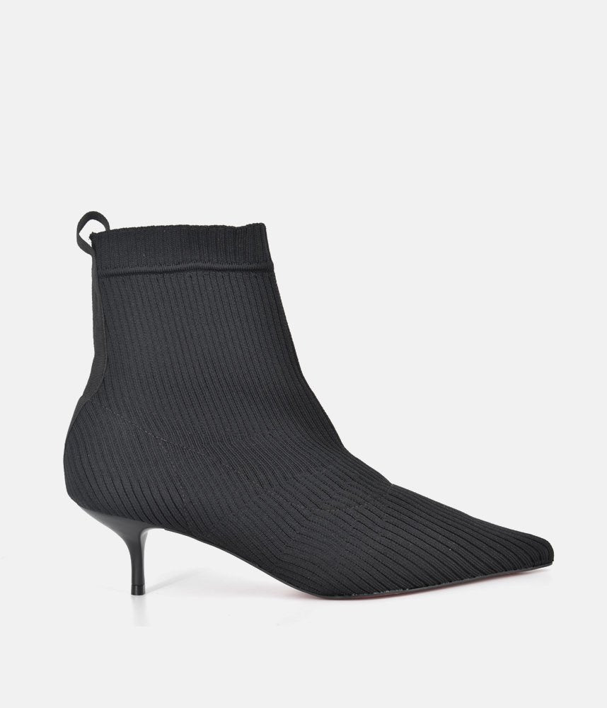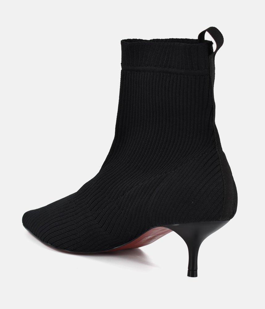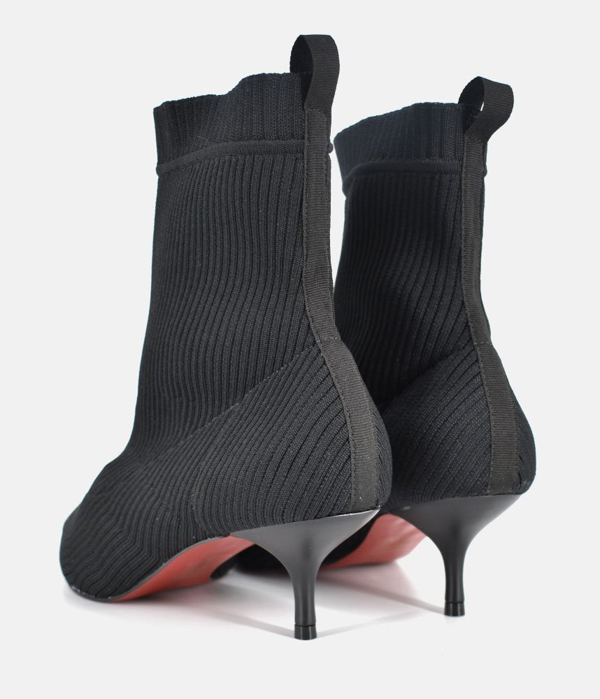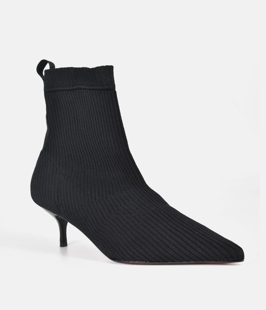 Embrace the modern, sleek aesthetic with these fashionable sock boots. They offer the comfort of a knit shoe combined with a sharp silhouette, making them incredibly versatile and on-trend. Featuring a pull-on sock-style made from fine ribbed black knit fabric, designed to hug the ankle for a smooth, flattering fit. The knitted construction ensures flexibility and ease of movement, offering superior comfort compared to traditional leather boots. Perfect for pairing with midi skirts, cropped trousers, or under smart denim to show off the sleek kitten heel.