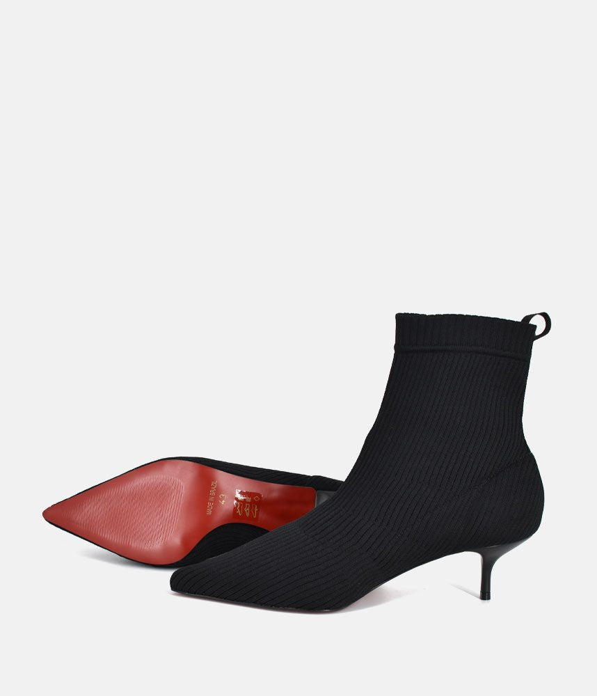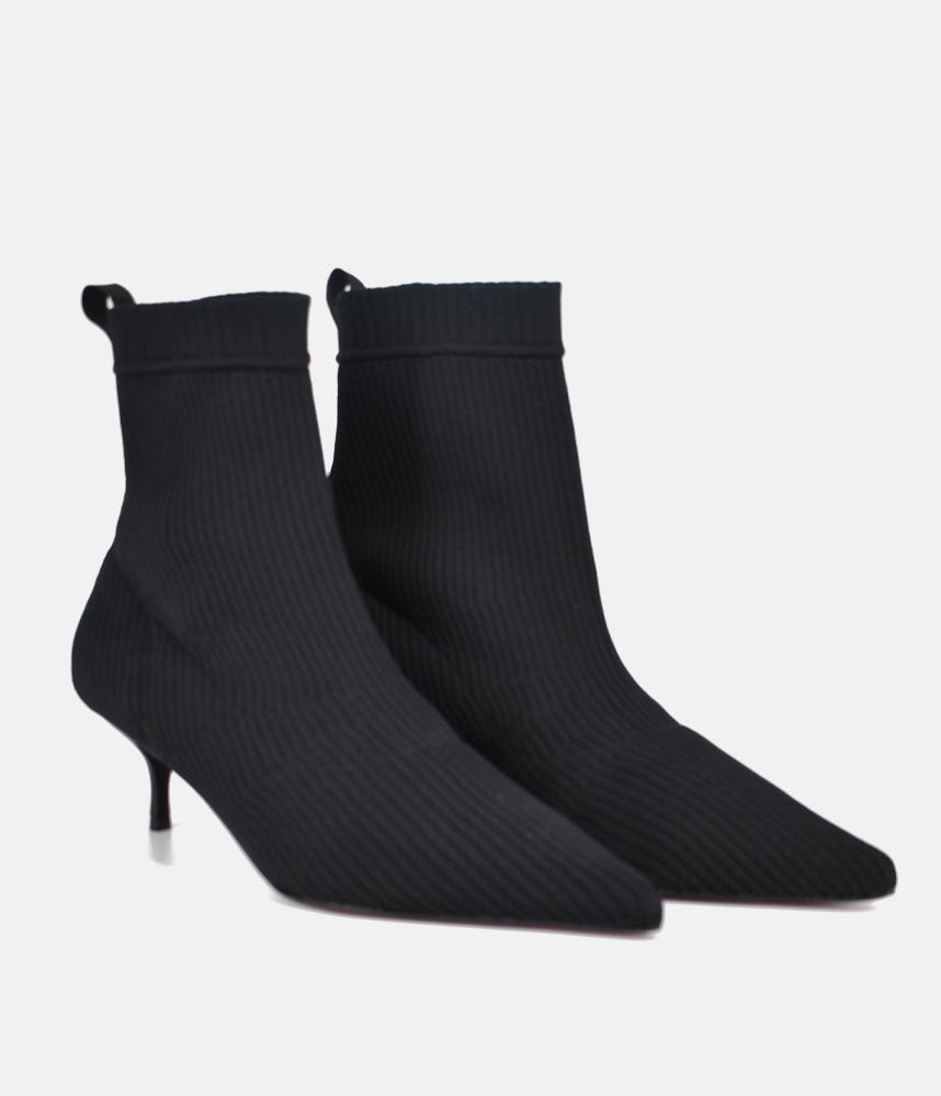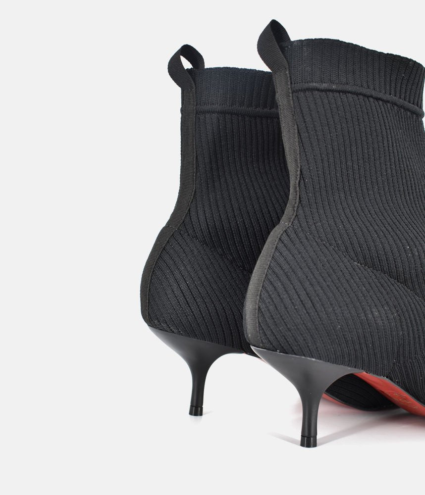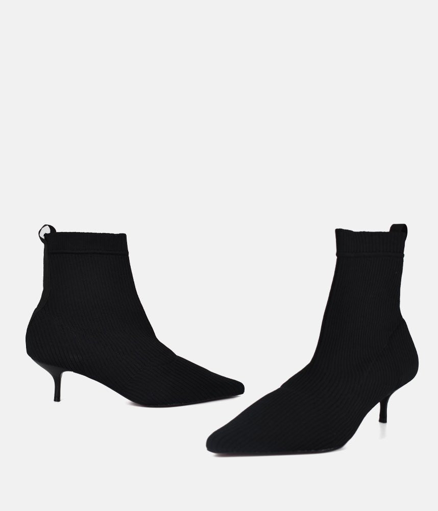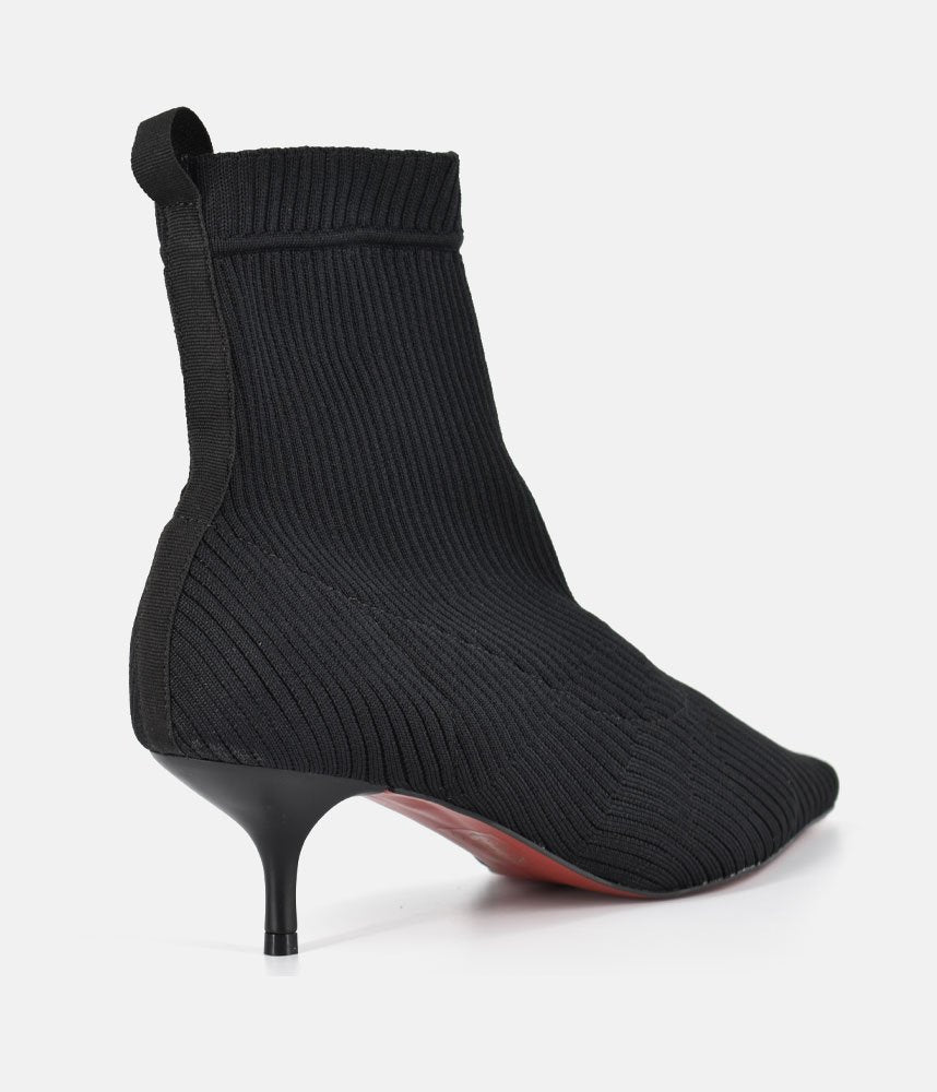 Embrace the modern, sleek aesthetic with these fashionable sock boots. They offer the comfort of a knit shoe combined with a sharp silhouette, making them incredibly versatile and on-trend. Featuring a pull-on sock-style made from fine ribbed black knit fabric, designed to hug the ankle for a smooth, flattering fit. The knitted construction ensures flexibility and ease of movement, offering superior comfort compared to traditional leather boots. Perfect for pairing with midi skirts, cropped trousers, or under smart denim to show off the sleek kitten heel.