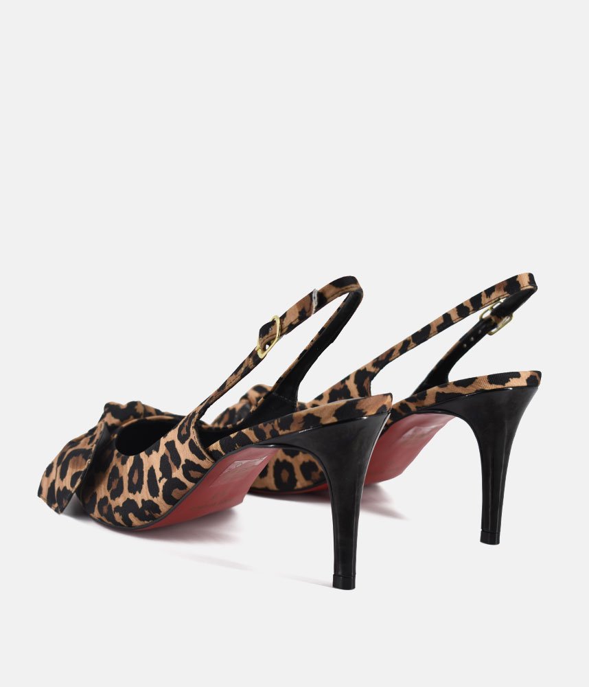 Make a statement with these playful yet sophisticated leopard print heels, perfect for injecting personality into any ensemble. Featuring a classic, striking leopard print across the entire shoe with a soft, suede-like texture. Design: Elegant pointed toe paired with a beautiful bow detail at the vamp for a feminine touch. Set on a slender stiletto heel, with a signature red sole detail. They also have an adjustable slingback strap for a secure fit. The ideal shoe to instantly elevate black separates, smart denim, or pair with a tailored dress for an evening event.