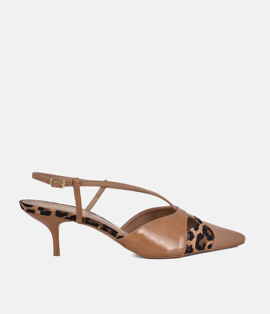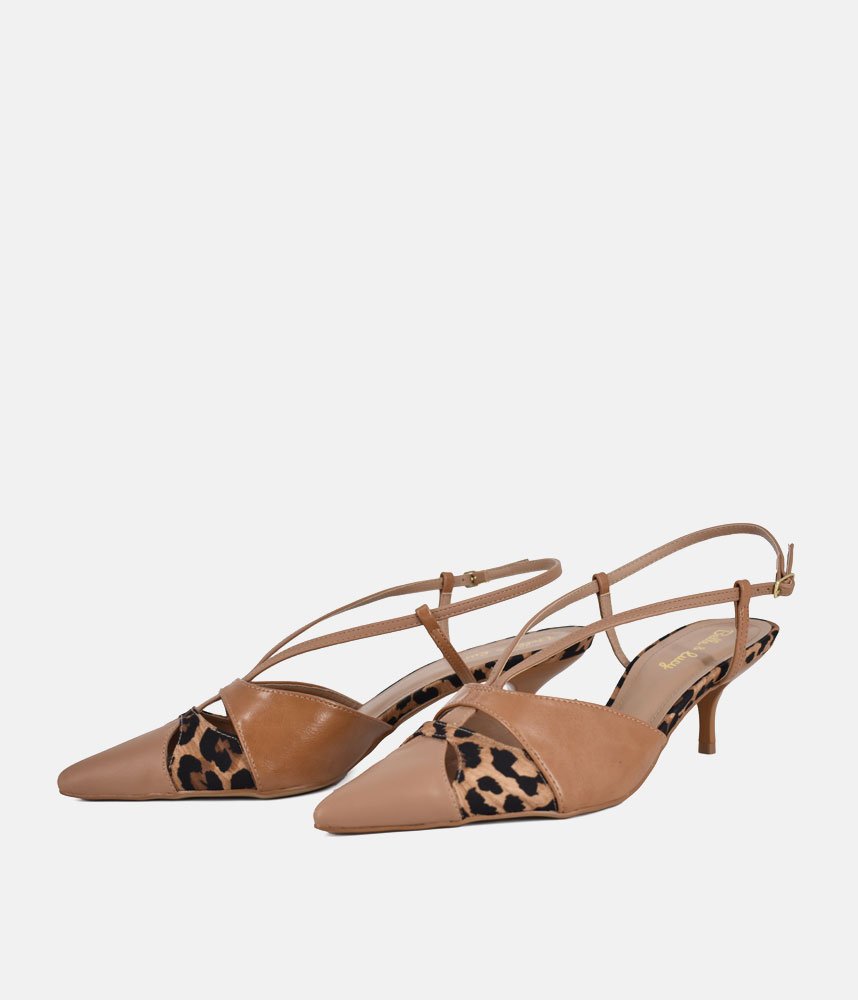 Unleash your wild side with these Belle & Lucy Chic Tan & Leopard Print Slingback Kitten Heels. These stylish heels effortlessly blend classic elegance with a touch of daring charm, perfect for adding a statement to any ensemble. Crafted with a refined pointed toe, the upper features a striking combination of smooth tan faux leather and an alluring leopard print accent on the vamp and heel. Delicate criss-cross straps beautifully frame the foot, leading to an adjustable slingback strap that ensures a secure and comfortable fit. The slender kitten heel provides a graceful lift, making these versatile heels ideal for both office wear and evening adventures.