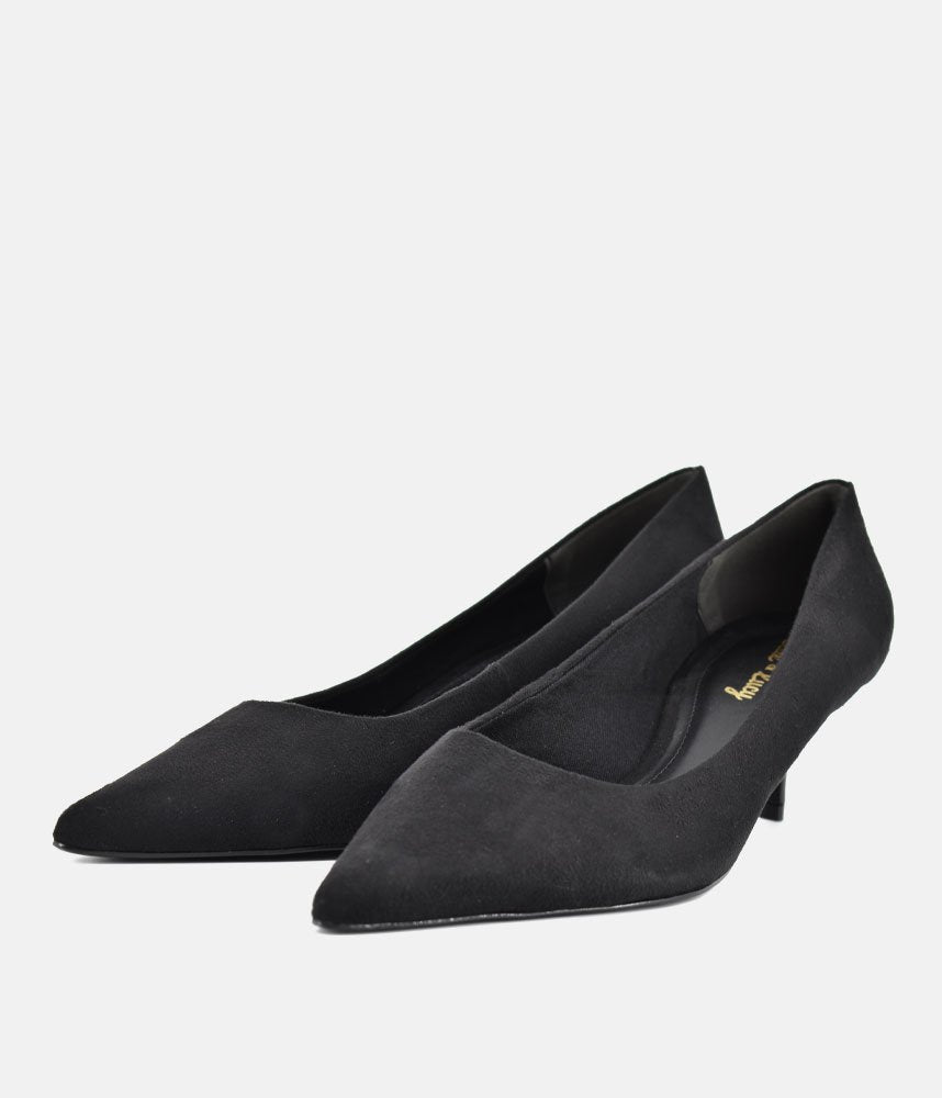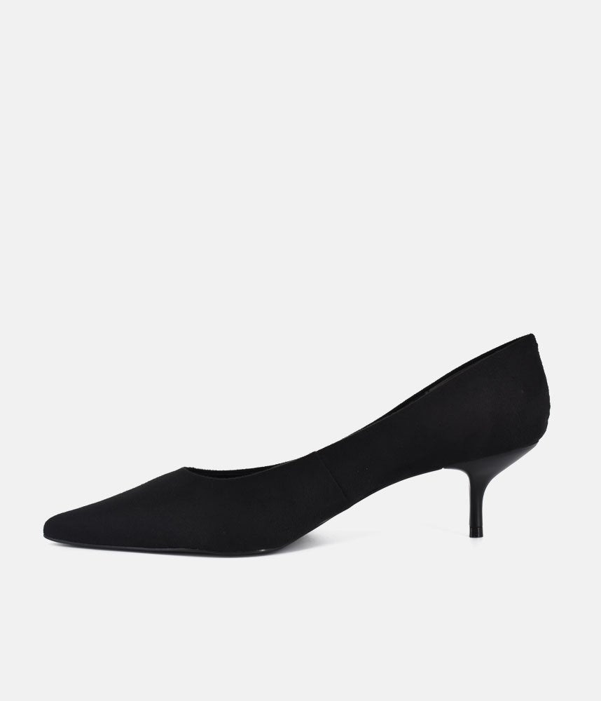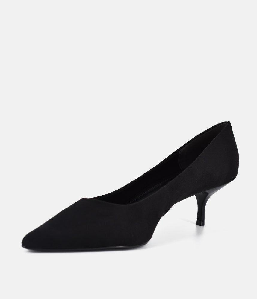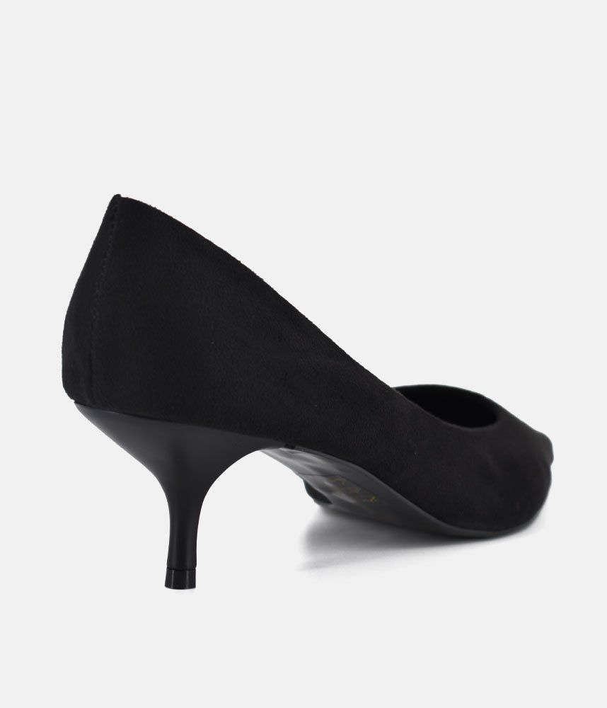 These elegant and timeless black pumps are the perfect wardrobe cornerstone, offering a sophisticated look with gentle, comfortable lift. Ideal for professional environments or relaxed evening wear. Crafted from a soft matte black suedette material, providing a luxurious texture and sophisticated finish that is versatile year-round. Set on a delicate low stiletto or kitten heel, offering subtle elevation that is exceptionally comfortable and easy to wear all day.