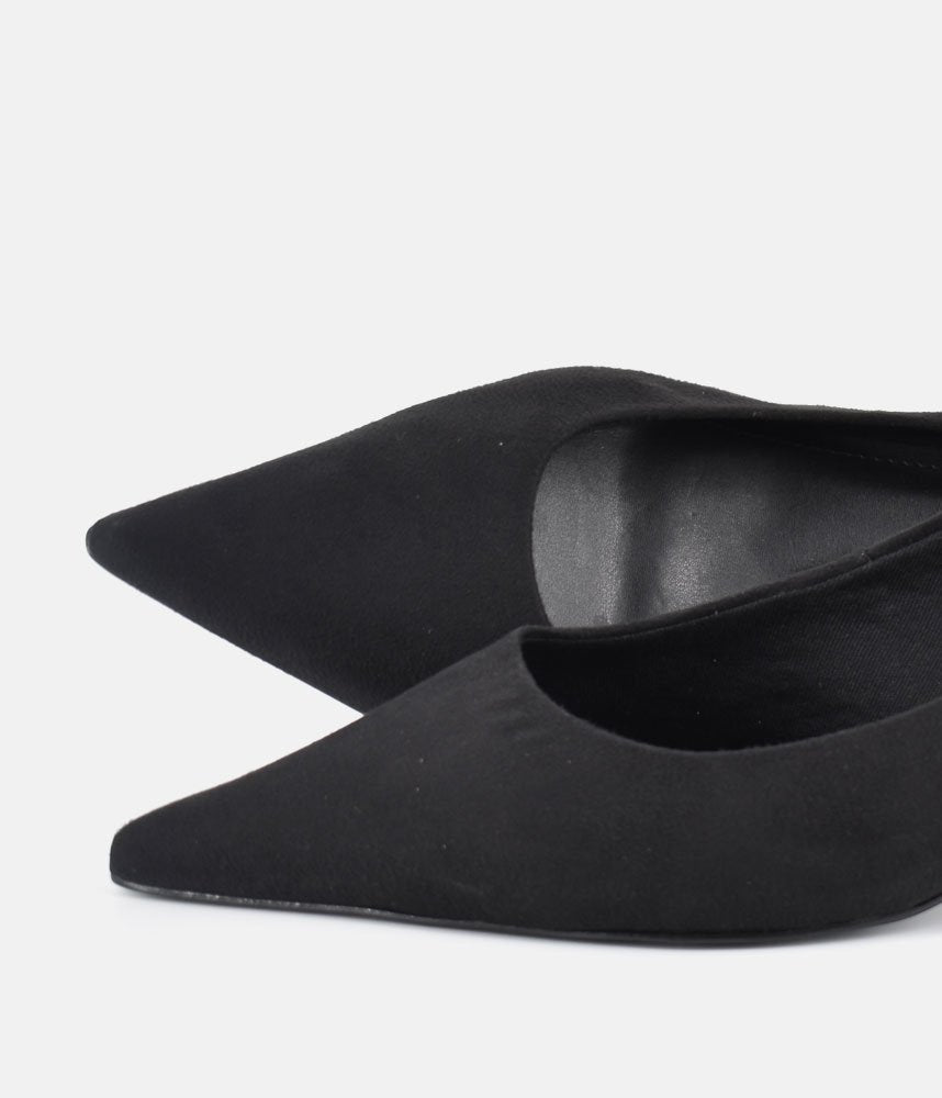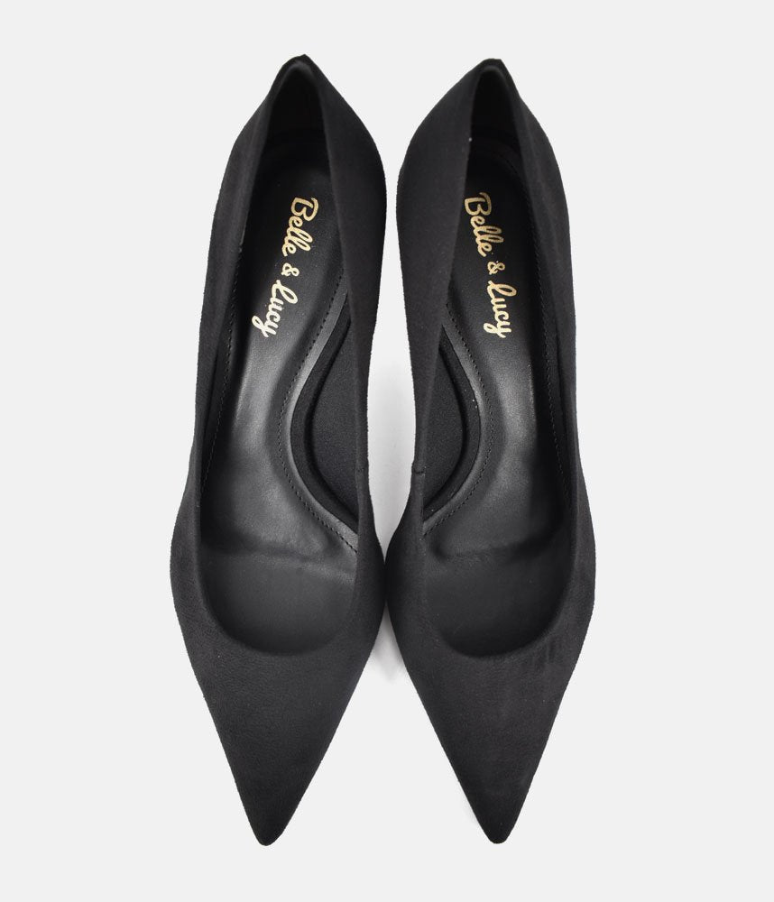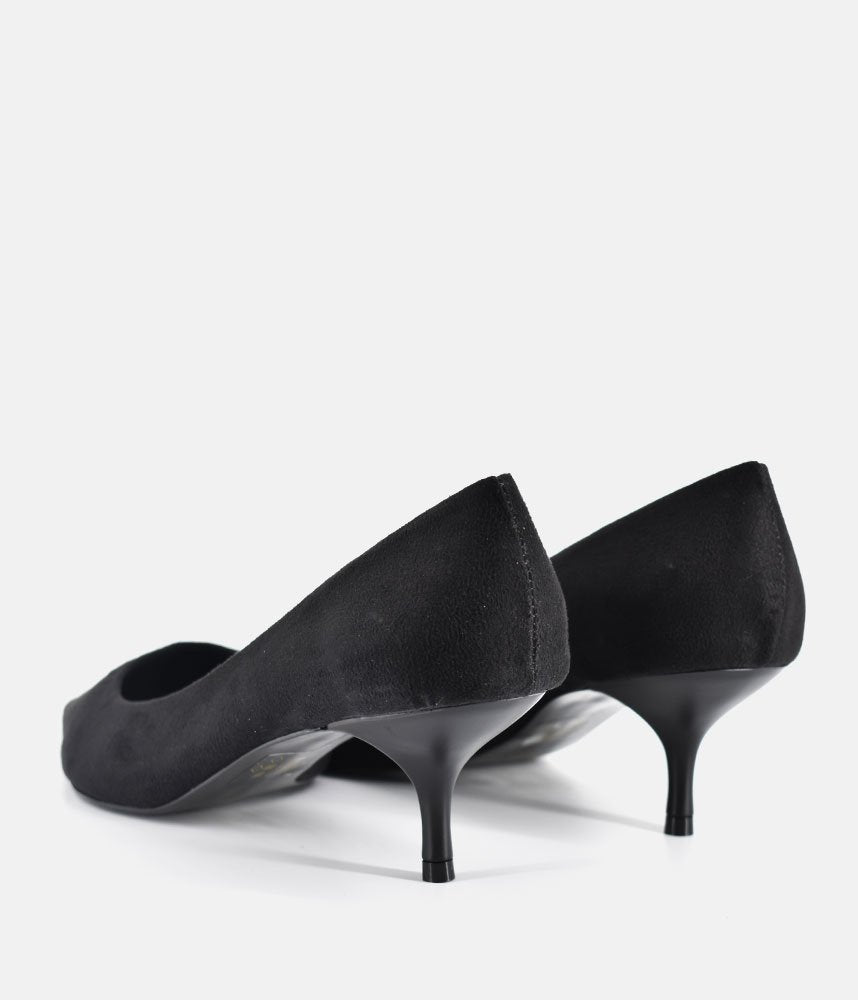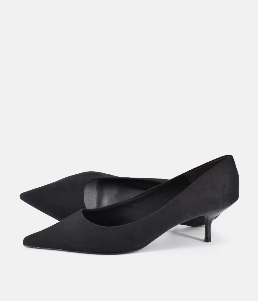 These elegant and timeless black pumps are the perfect wardrobe cornerstone, offering a sophisticated look with gentle, comfortable lift. Ideal for professional environments or relaxed evening wear. Crafted from a soft matte black suedette material, providing a luxurious texture and sophisticated finish that is versatile year-round. Set on a delicate low stiletto or kitten heel, offering subtle elevation that is exceptionally comfortable and easy to wear all day.