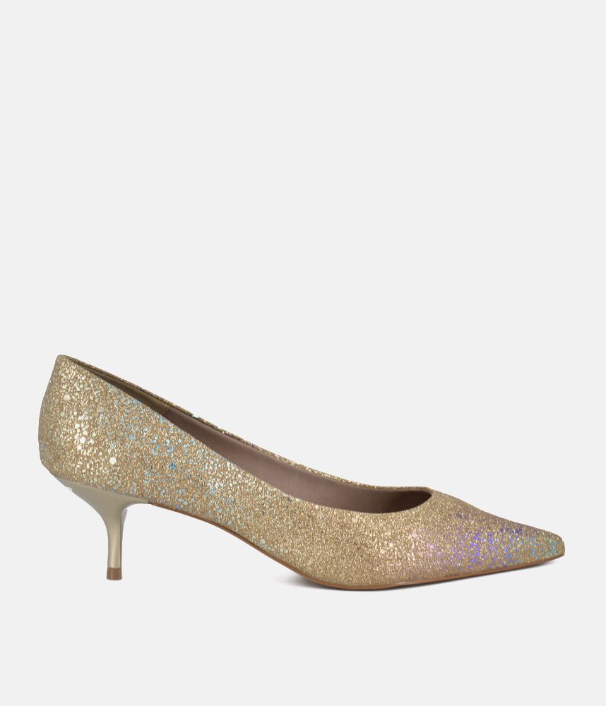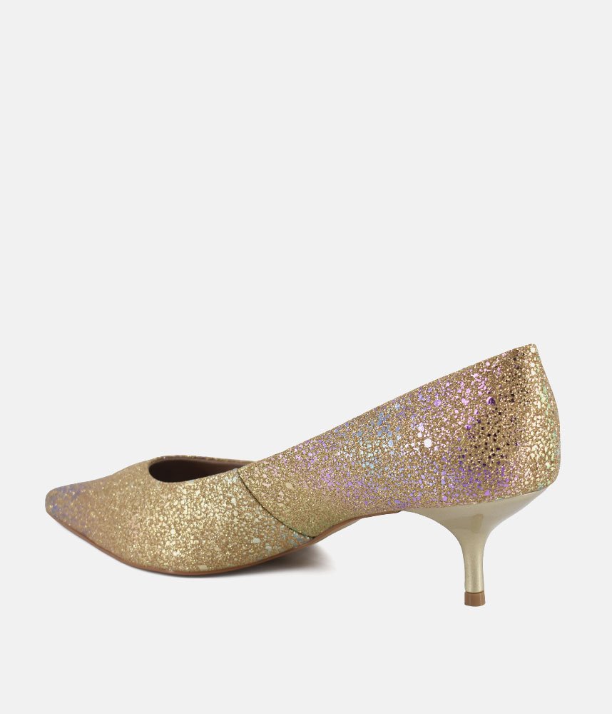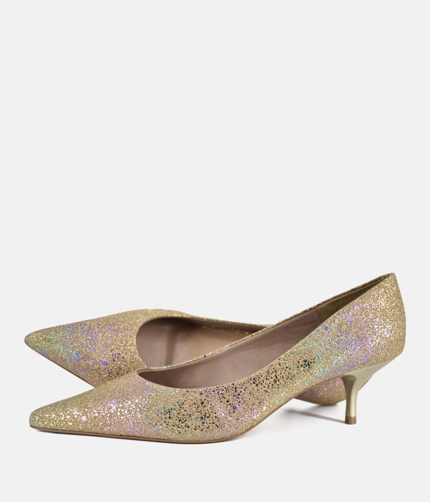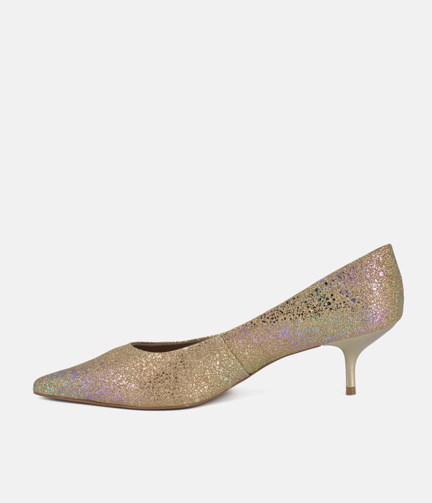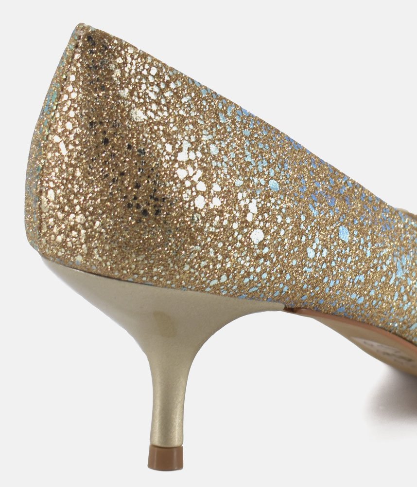 Get ready to dazzle with these enchanting Gold heels! Perfect for adding a touch of fairy-tale sparkle to any outfit, these pumps are designed to make you feel like the belle of the ball. The shimmering finish catches every light, while the elegant pointed toe and comfortable kitten heel offer both sophistication and ease of wear. Whether it's a wedding, a party, or just a night out where you want to shine, these heels are your ticket to unforgettable glamour.