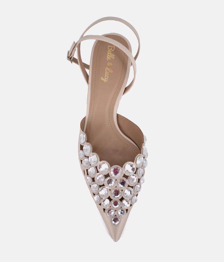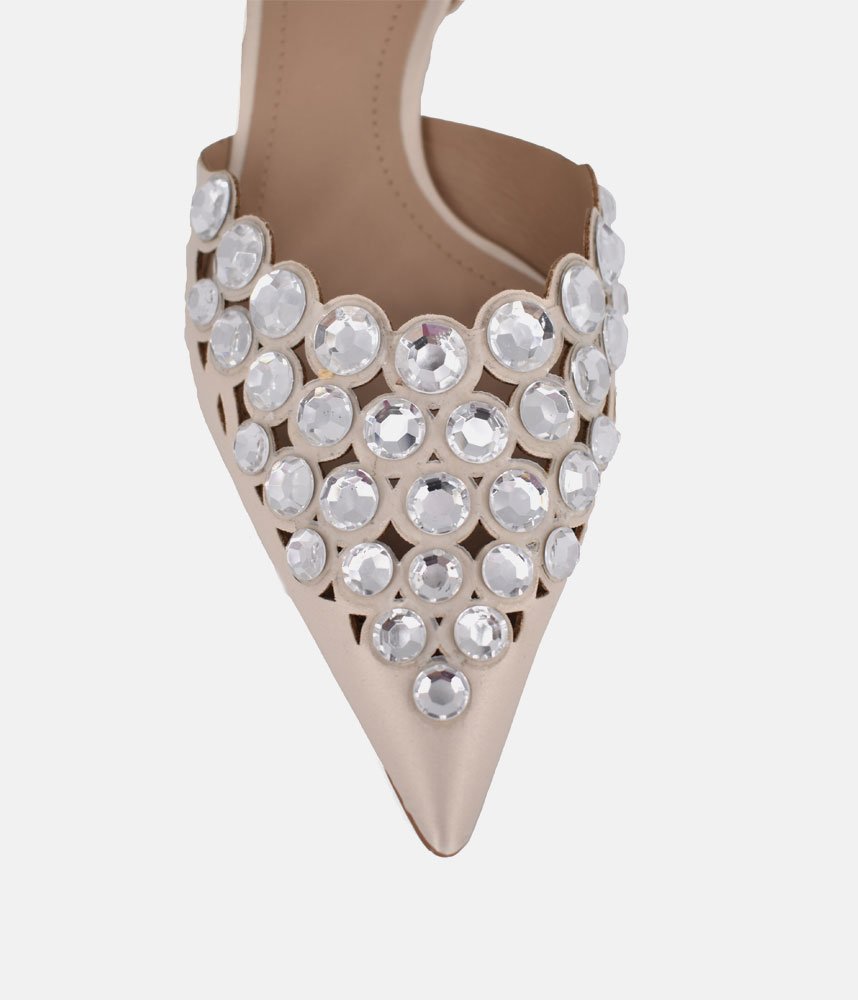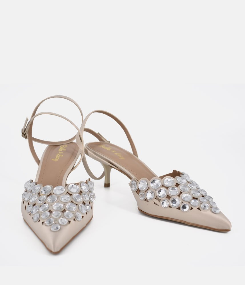 Step out in sophisticated style with these 2 inch Almond ankle strap heels. Crafted from luxurious Almond satin they feature a delicate ankle strap for a secure and flattering fit. The focal point is the stunning embellishment of sparkling crystal circles on the front, adding a touch of glamour that will catch the light with every step. Perfect for evening events or adding a chic touch to any outfit.