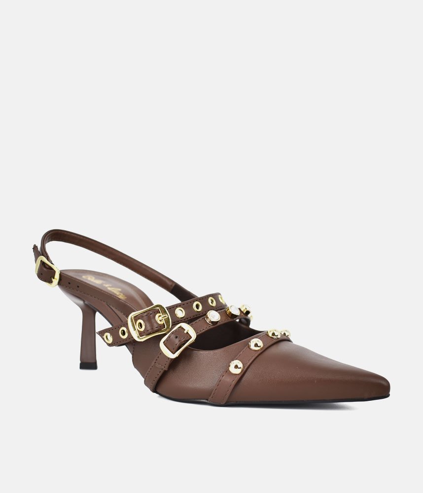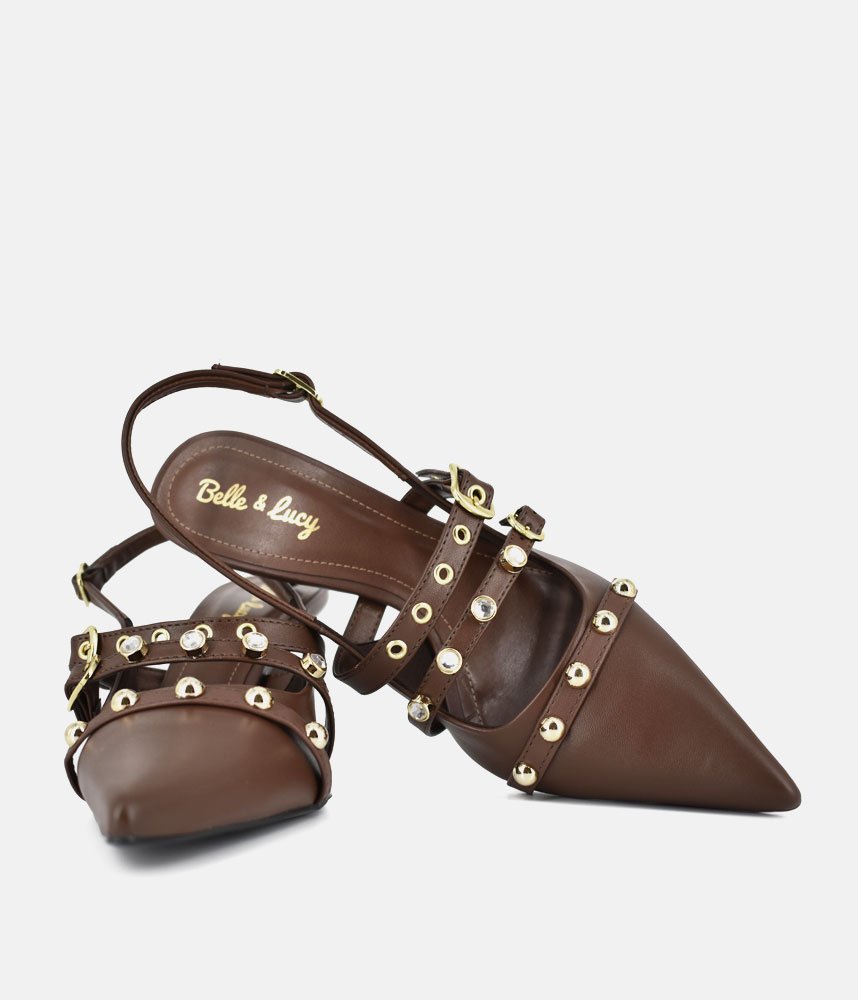 Escape the ordinary with the Belle & Lucy Rich Brown Faux Leather Slingback Heels. These stunning heels offer a refreshing take on glamour, featuring a pristine Brown faux leather upper that radiates subtle luxury. The captivating design is brought to life by a rich tapestry of embellishments, including chic studs, brilliant crystals, and distinctive eyelets, all harmoniously arranged to create an eye-catching effect. Perfect for making a memorable entrance, these Belle & Lucy heels provide a comfortable yet striking foundation for any special occasion.
