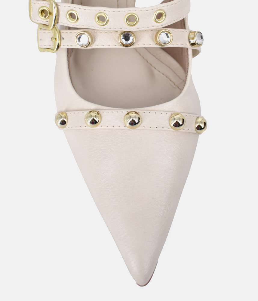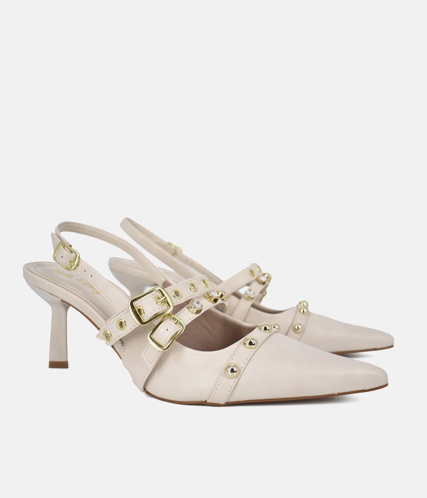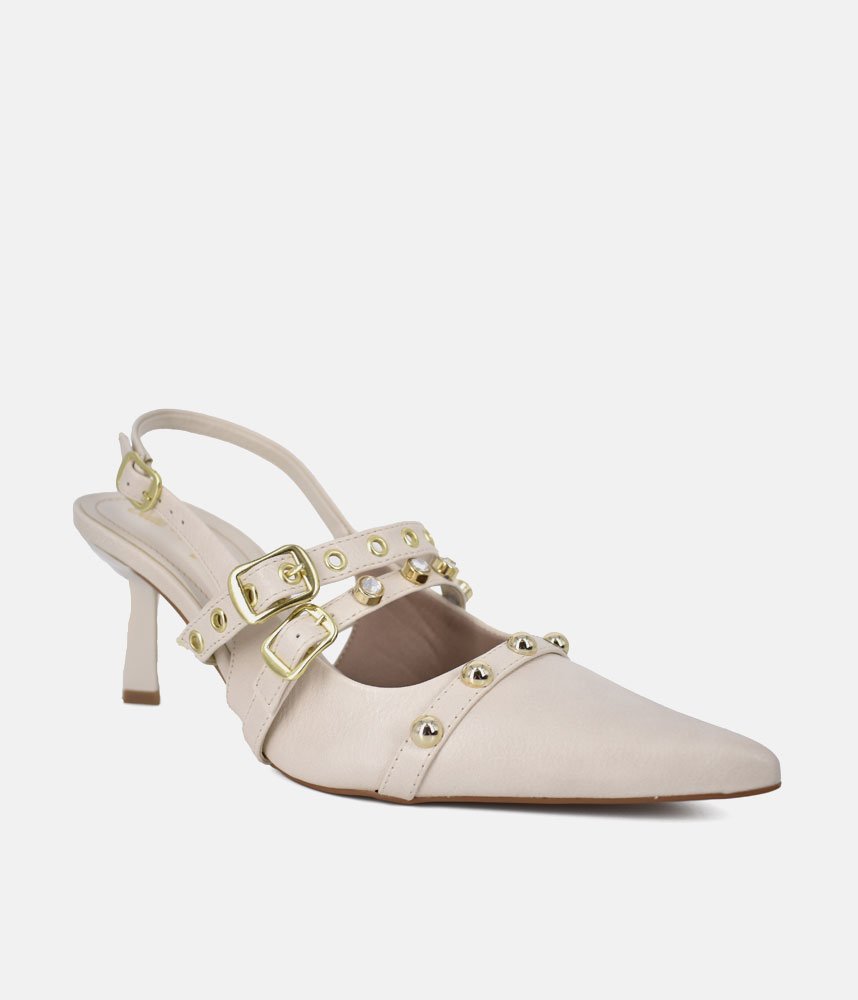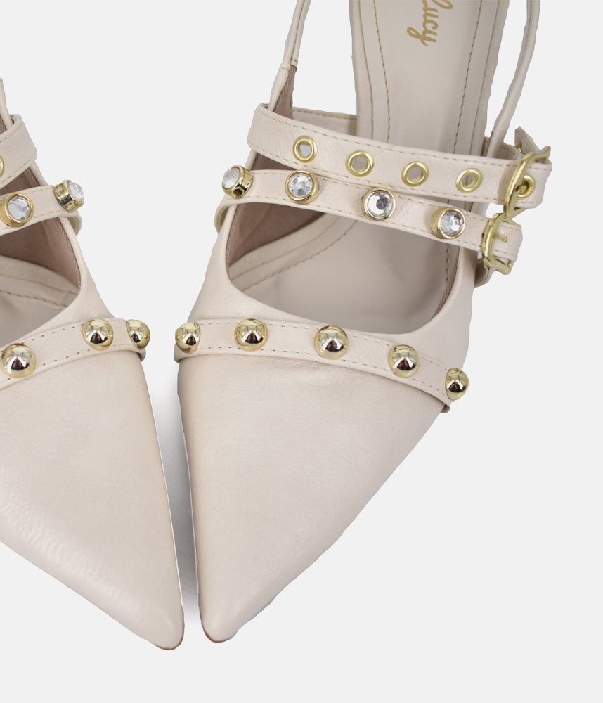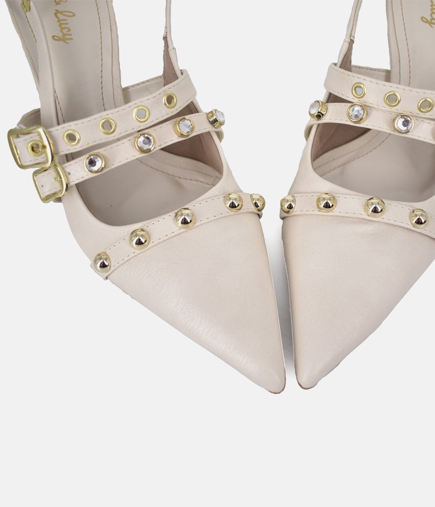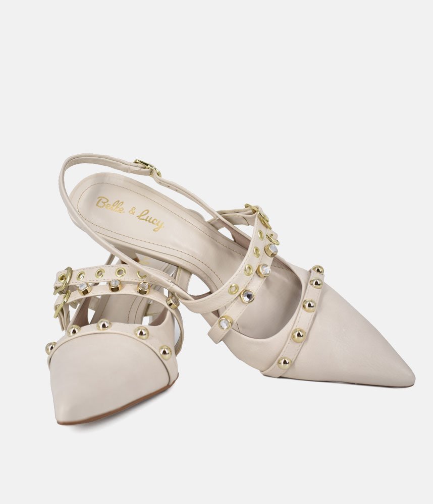 Escape the ordinary with the Belle & Lucy Off-White Faux Leather Slingback Heels. These stunning heels offer a refreshing take on glamour, featuring a pristine off-white faux leather upper that radiates subtle luxury. The captivating design is brought to life by a rich tapestry of embellishments, including chic studs, brilliant crystals, and distinctive eyelets, all harmoniously arranged to create an eye-catching effect. Perfect for making a memorable entrance, these Belle & Lucy heels provide a comfortable yet striking foundation for any special occasion.