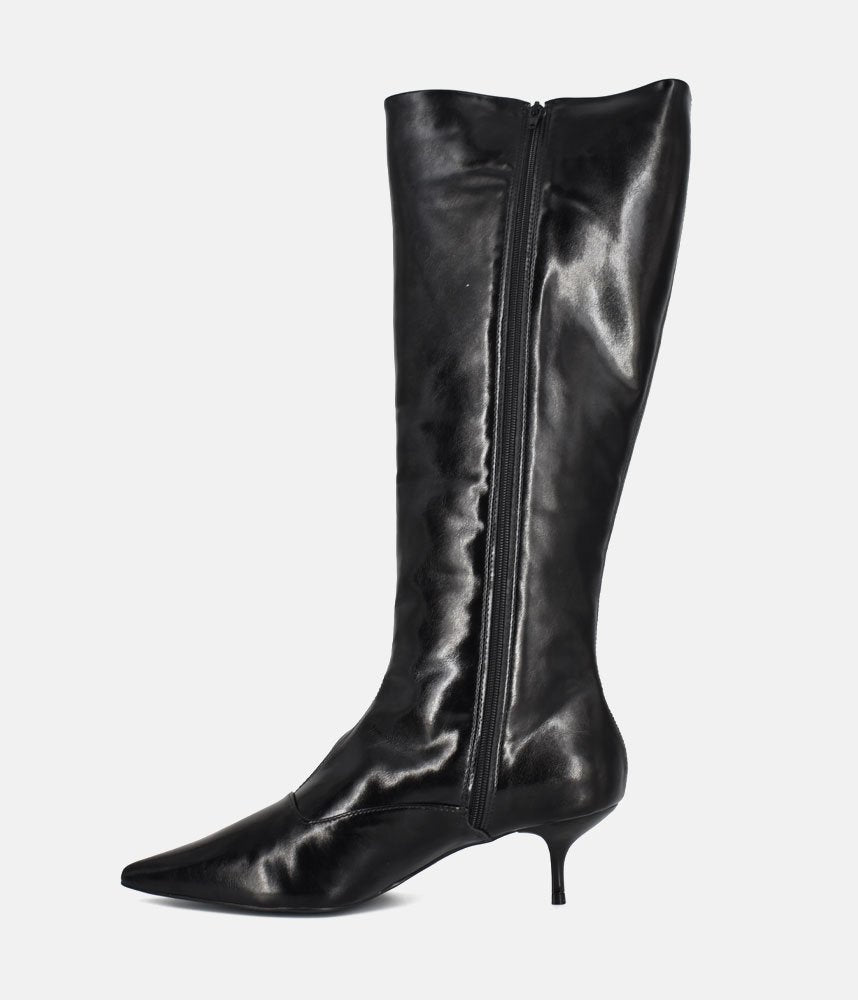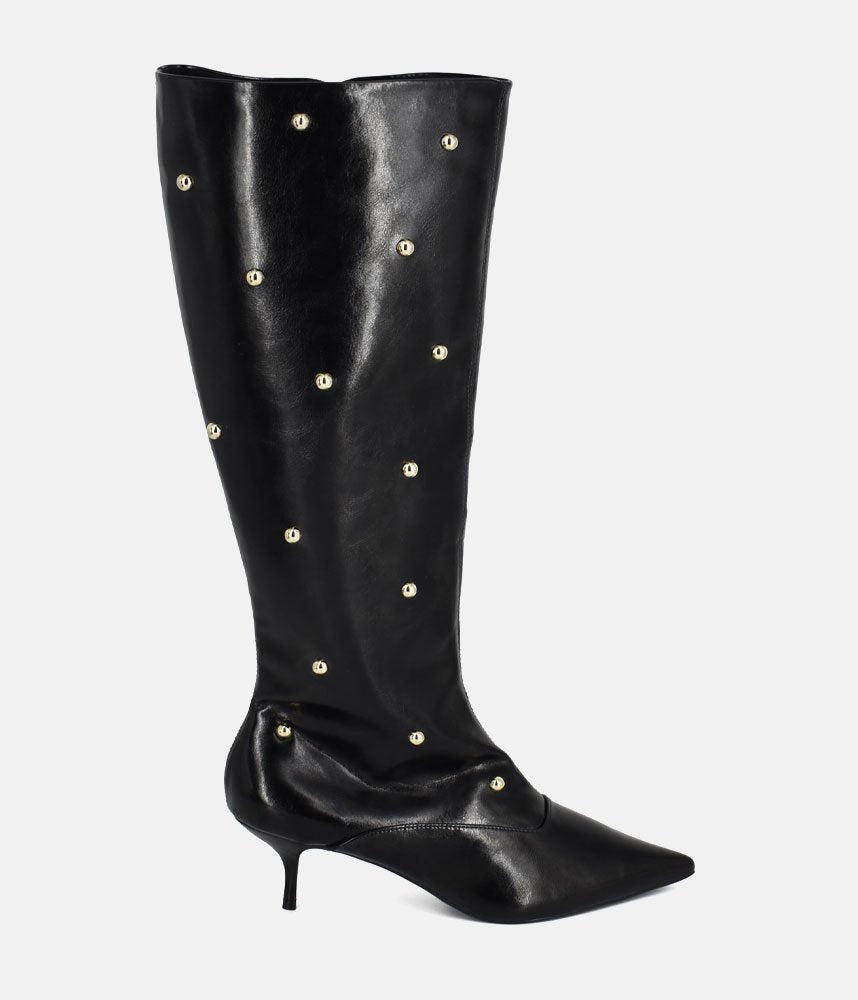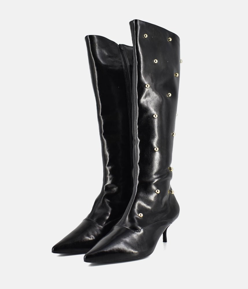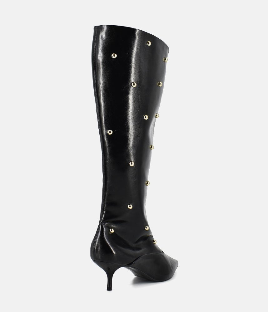 Make a bold fashion statement with these striking boots that perfectly balance high-impact style with a comfortable, sleek silhouette. Featuring a classic knee-high length with a refined, pointed toe shape. The wide shaft opening allows for a stylish, relaxed fit. Adorned with scattered silver stud embellishments running up the shaft, adding a sophisticated, rock-chic edge to the classic black boot. Set on a delicate and on-trend kitten heel, offering comfortable lift that is easy to wear all day while maintaining a high-fashion profile. Perfect for pairing with tights and mini skirts.