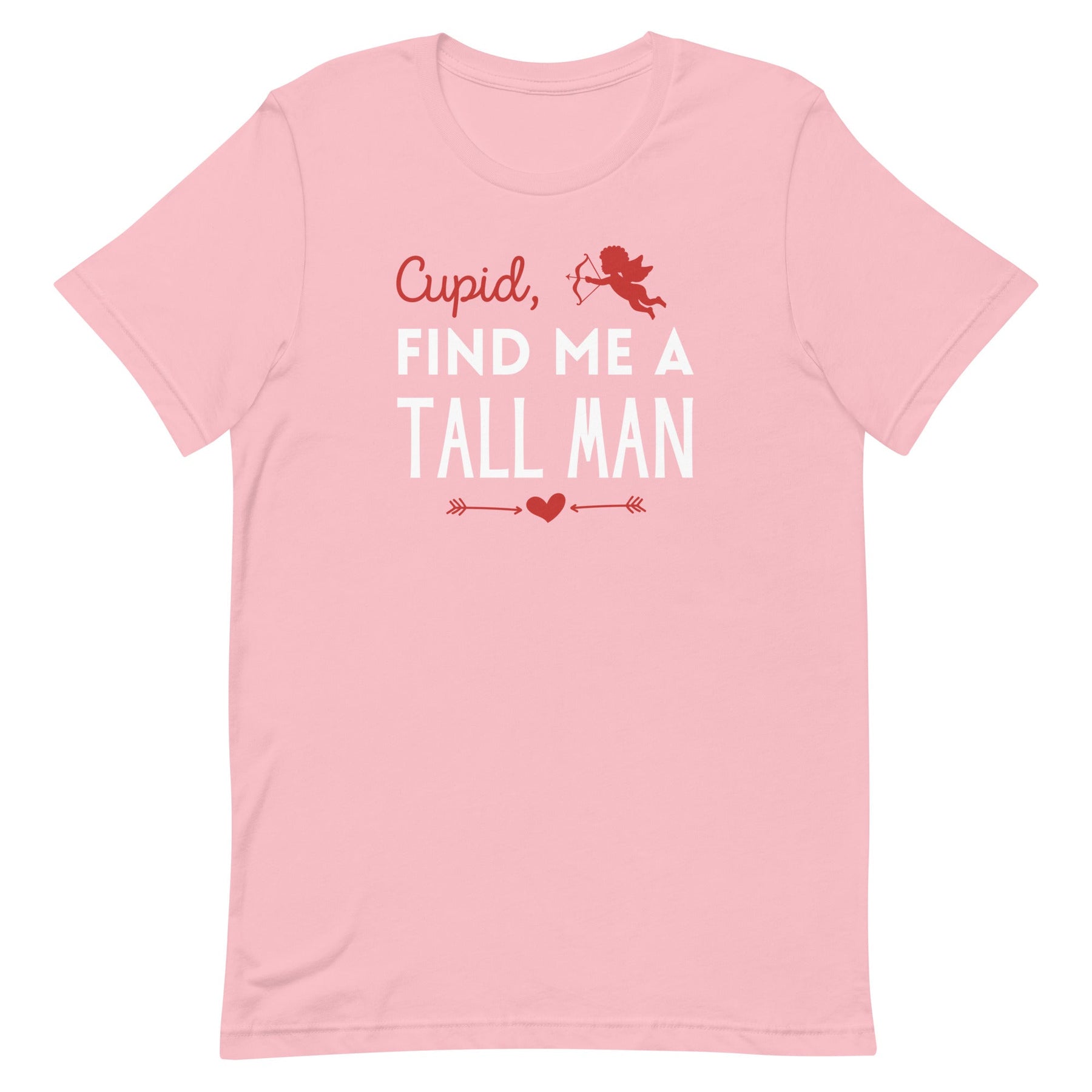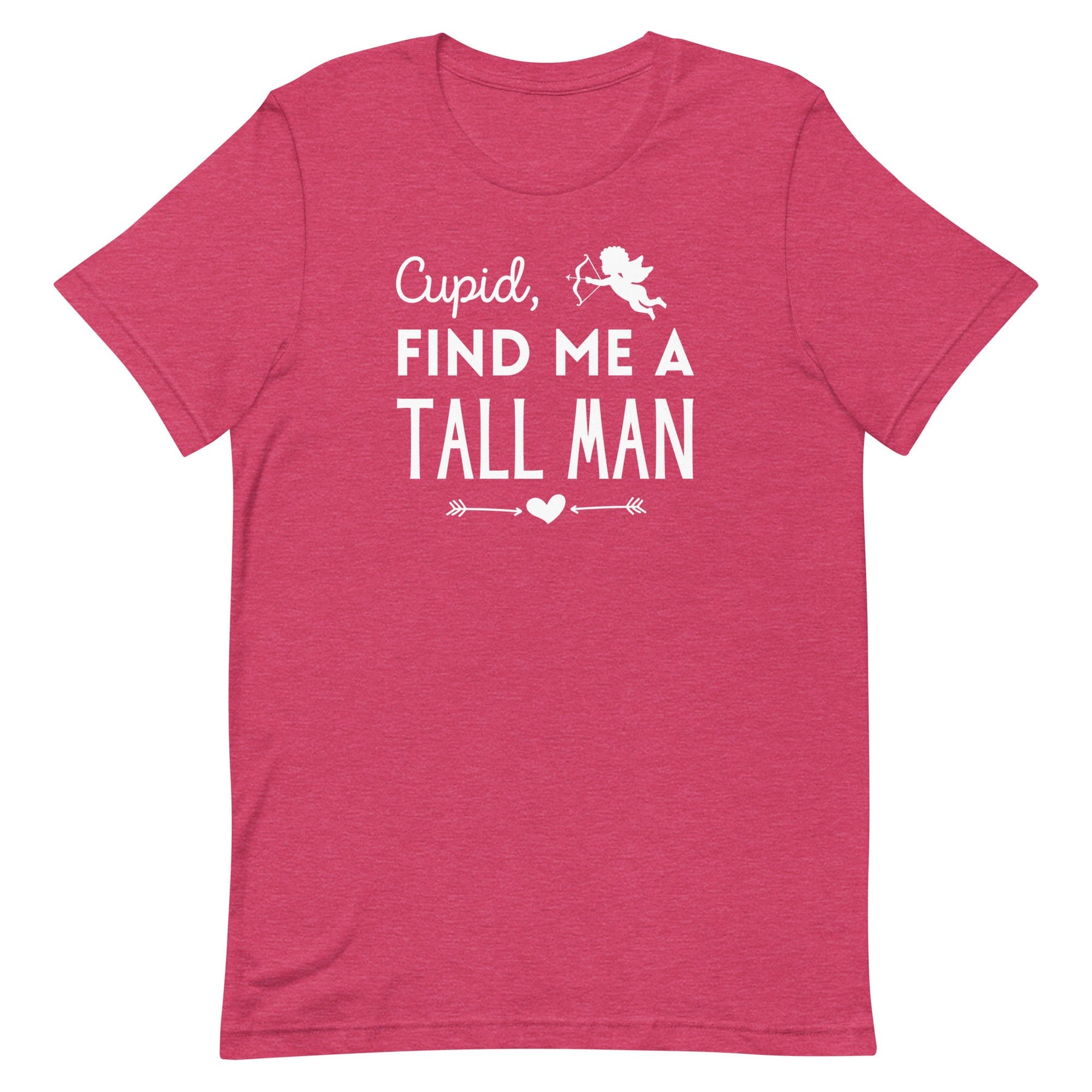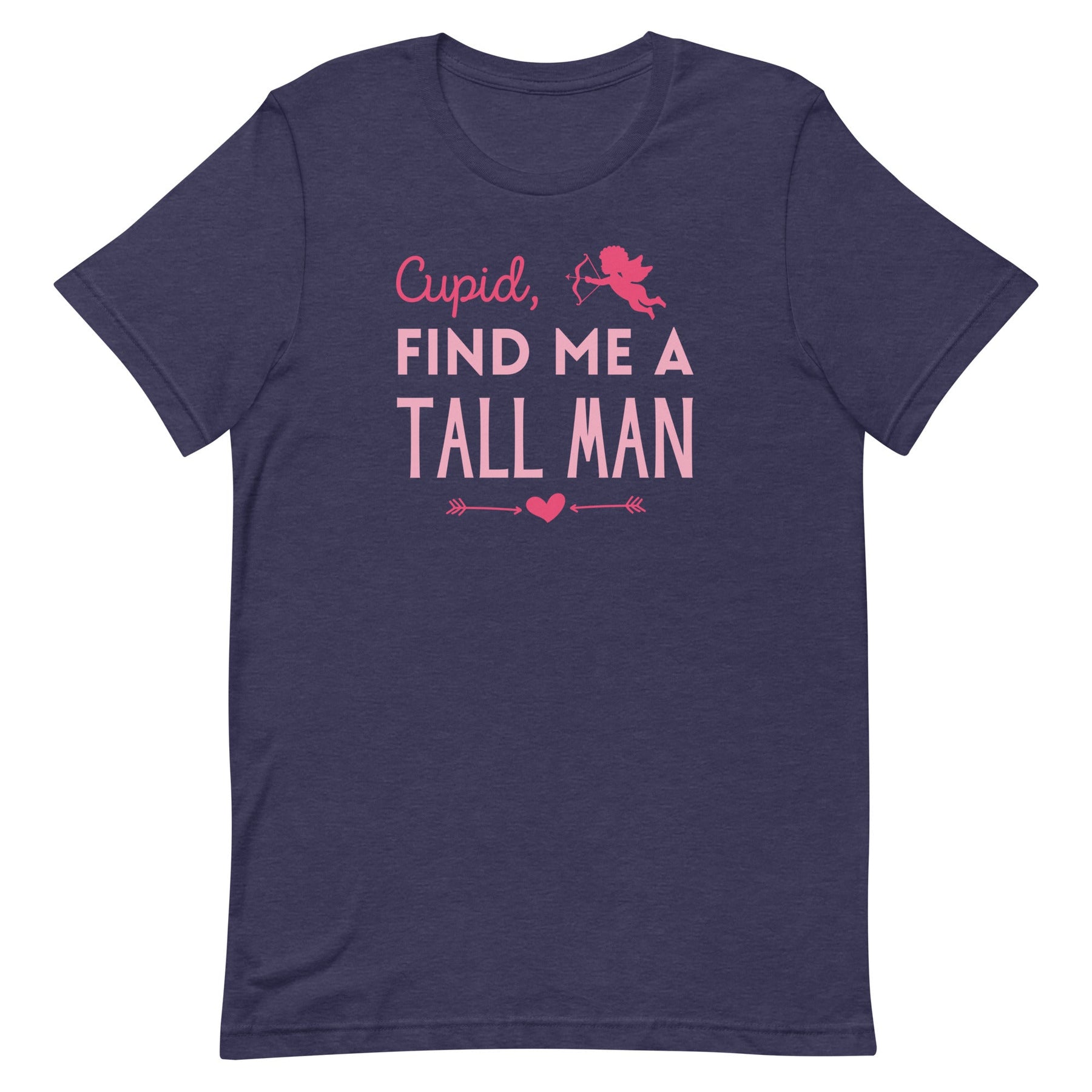 Come on, Cupid, give the tall ladies what they want for Valentine's Day this year...a TALL MAN! This funny women's graphic t-shirt is perfect for those who are looking for love and want a man with some height. It has a trendy font design with a cute flying cupid and heart detail that comes in a colorful Valentine's theme or a solid print. Not only will you be falling in love with a tall man (fingers crossed!), but you'll also fall in love with this fun tee!