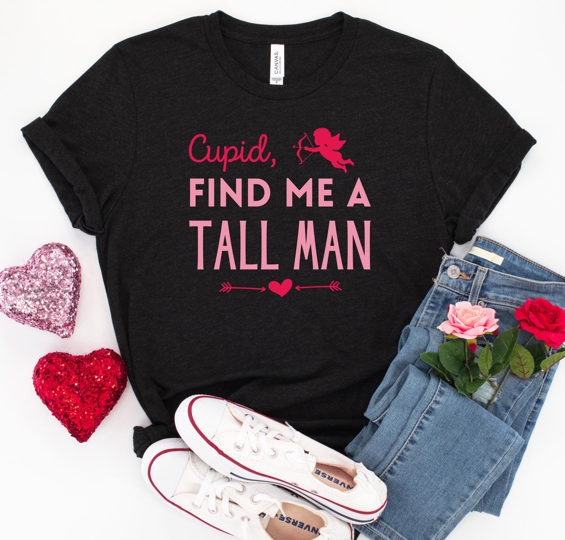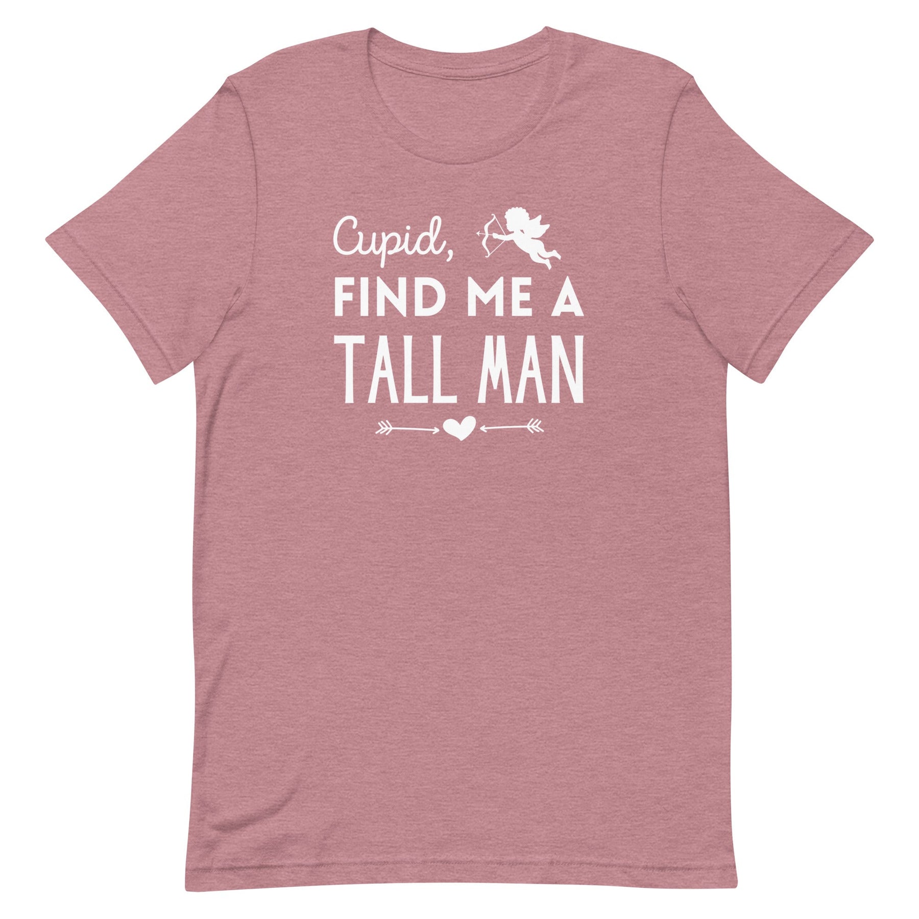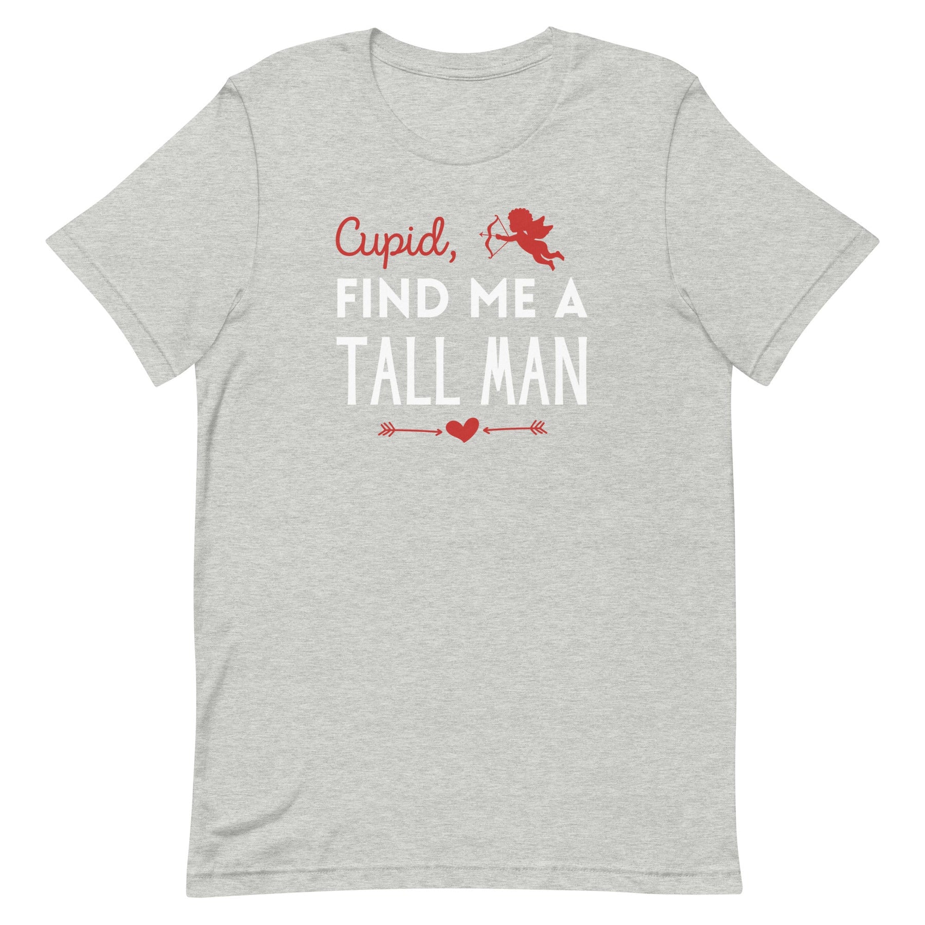 Come on, Cupid, give the tall ladies what they want for Valentine's Day this year...a TALL MAN! This funny women's graphic t-shirt is perfect for those who are looking for love and want a man with some height. It has a trendy font design with a cute flying cupid and heart detail that comes in a colorful Valentine's theme or a solid print. Not only will you be falling in love with a tall man (fingers crossed!), but you'll also fall in love with this fun tee!