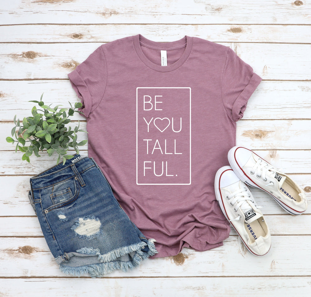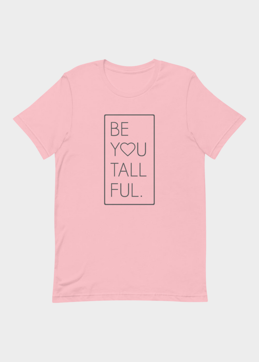 This inspirational t-shirt offers the best play-on-words yet for anyone who is blessed with above-average height. And, you won't find it anywhere else except here at Tall Reali-tees. Celebrate your exceptional beauty in a charming tee that offers the perfect motto for tall women all over the world! This graphic t-shirt makes an ideal gift for not only yourself but also for a tall friend or family member looking to show their pride in being uniquely "Be-You-Tall-Ful".