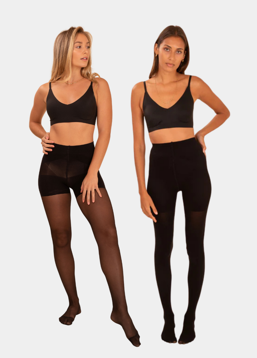 You can't go wrong with this duo. Our Black Contour Bestsellers Bundle includes one pair of our Opaque Contour (60 denier) tights and one pair of our Sheer Contour (20 denier) tights in Black. These are the two staples you need for your Fall and Winter wardrobe. Both pairs have our signature contoured control top.