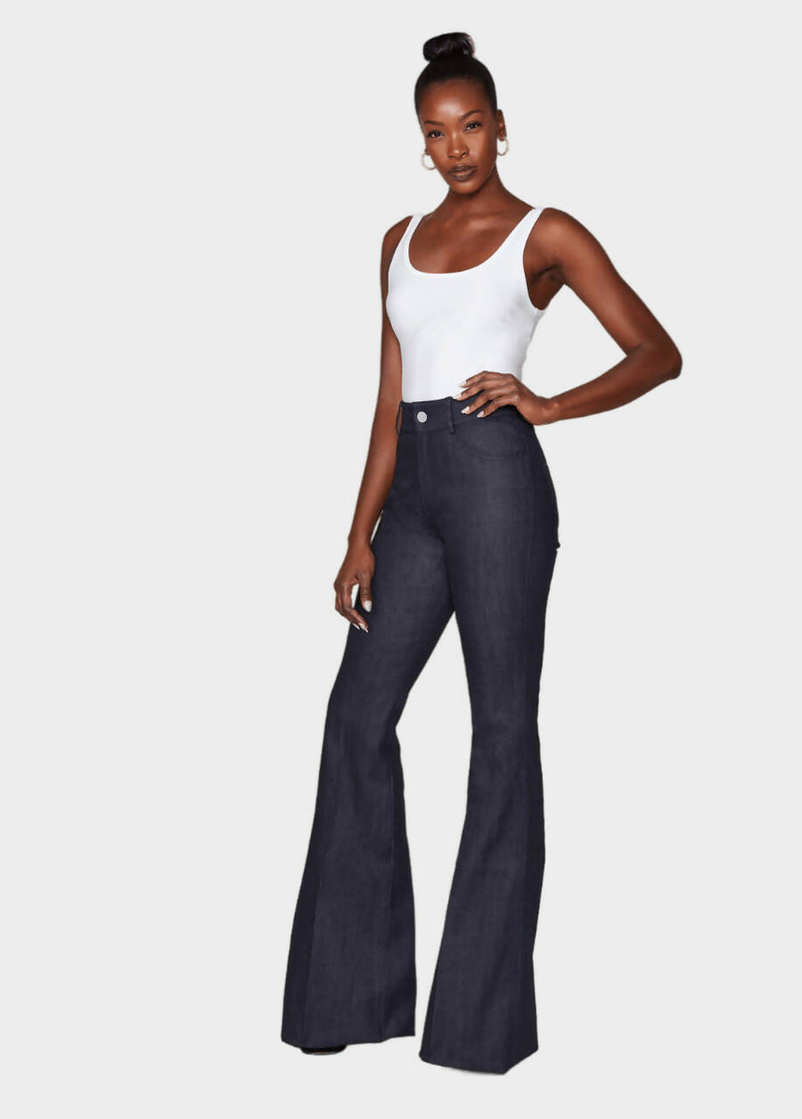The Celeta stretch denim pant features a high waist and flared silhouette that lifts your butt and makes your waist disappear. It also features a five-pocket design with a zip fly closure and contrast piping detail. Dress it up with your favorite statement blouse or down with a tank or V-neck tee.