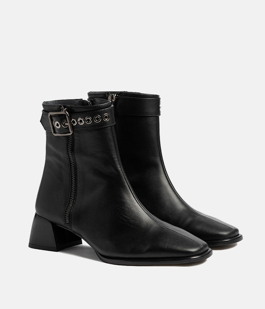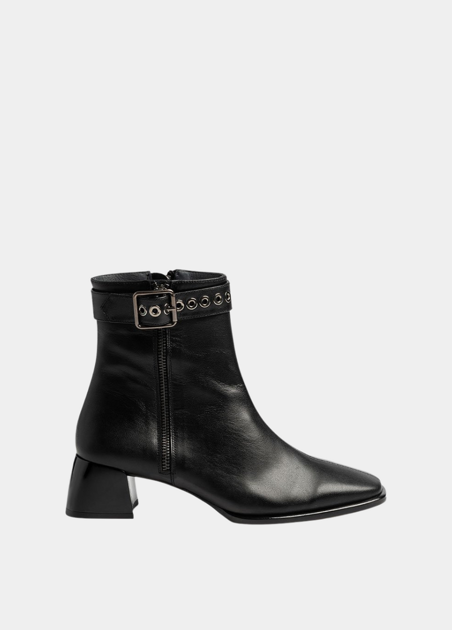 A versatile and classic style from Dansi; Crafted from supple black nappa leather, these boots offer a luxurious feel and a modern, versatile design. The striking ankle strap with silver-tone grommet and buckle details adds a touch of moto-inspired edge, while the square toe and comfortable flared block heel create a fashionable and stable silhouette. These boots are perfect for adding a dose of personality to any outfit.