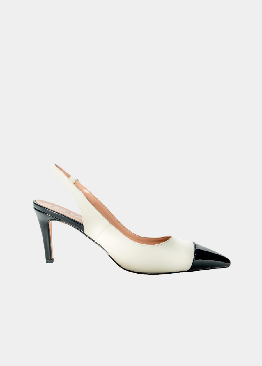 The Drew Slingback Pumps bring a modern, classic touch to the timeless slingback silhouette. Finished in creamy white and accented with black vegan leather, this shoe is perfect for events and professional settings alike. The Drew Slingback Pumps slides on with ease and add an ultra-sleek touch to even the most classic ensemble. With simple styling, these shoes simultaneously add just the right amount of color balance to your outfits. Drew is a slingback pump that you'll never want to part with.