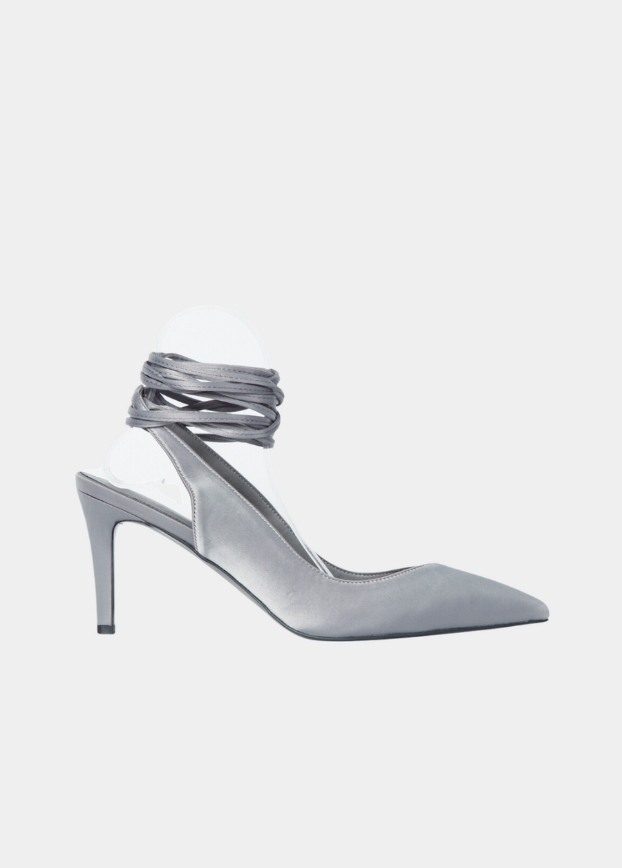 Introducing Estelle, the premium wrap pump that makes a statement in every setting. Crafted with the finest satin material, these shoes exude elegance and sophistication through their unique reflective undertones, wrap-up silhouette, and gem-toned colors of Silver.
