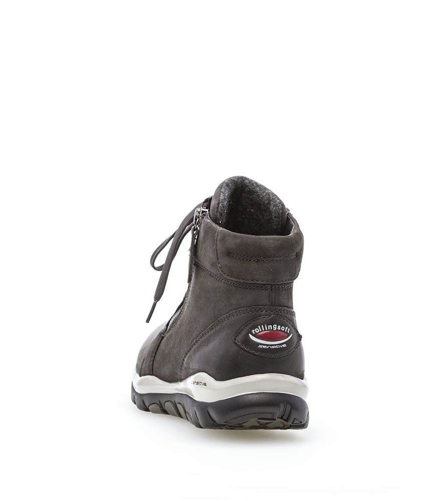 A Modern sporty sneaker bootie from Gabor, incorporating Gabor’s ‘Rolling Soft’ technology. High quality greased Nubuck with contrasting white on the sole. With rolling soft, Gabor has developed shoes that not only look fashionable but can also do something for your well-being with every step you take. The result: a comfortable, modern shoe with a roll-over effect that can improve posture both when walking and standing.