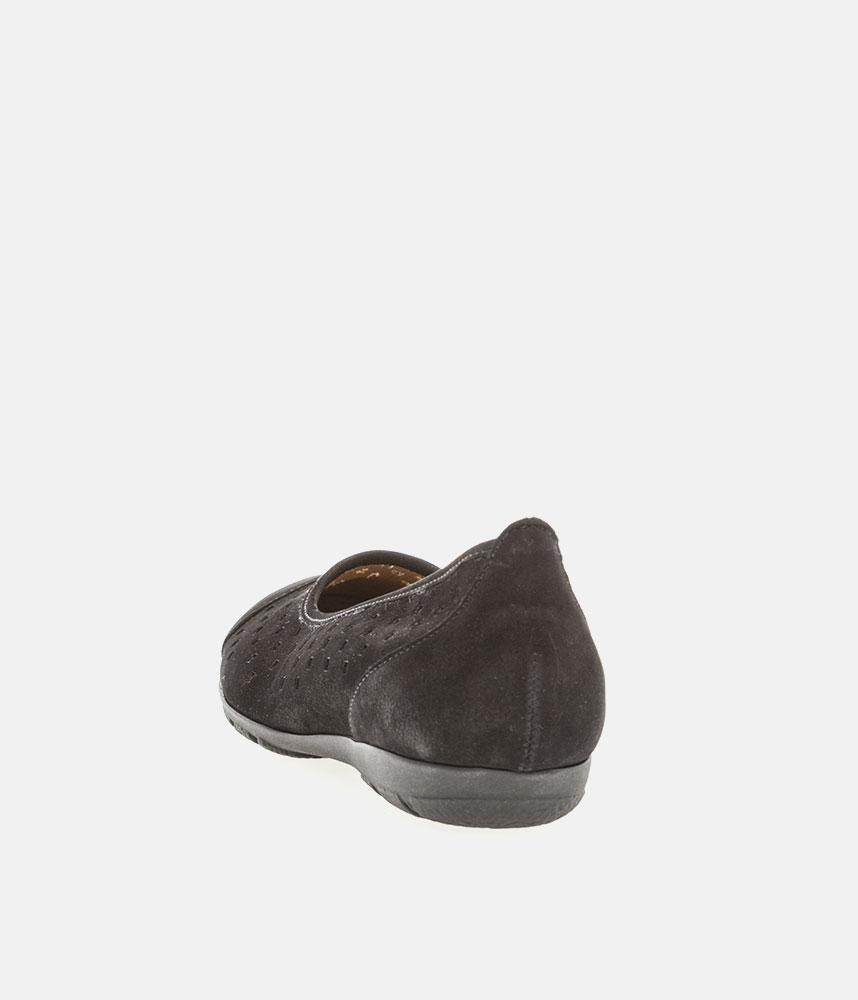 Pretty Casual Black Ballerina pump with Suede uppers with perforated detailing. Incorporating Gabor's air cushioned 'Hovercraft' technology with elasticated top line for easy fit.