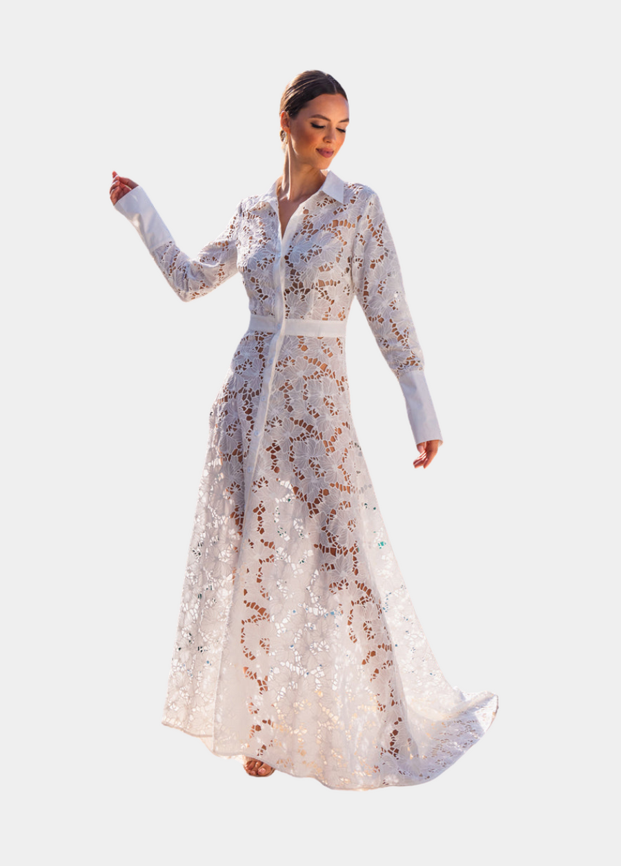 All eyes on YOU. This maxi dress features a train, in a bold textured lace fabric for an elevated look. With this versatile piece, you’re sure to have all eyes on you. We suggest wearing this dress with a nude liner.