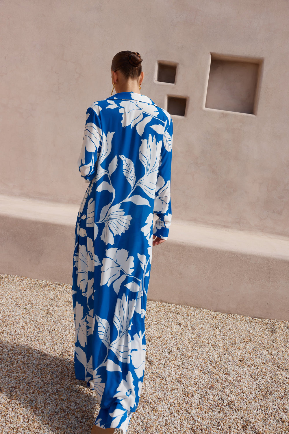 The standout of the season. This maxi duster coverup coat features an oversized blue floral print for a standout look.