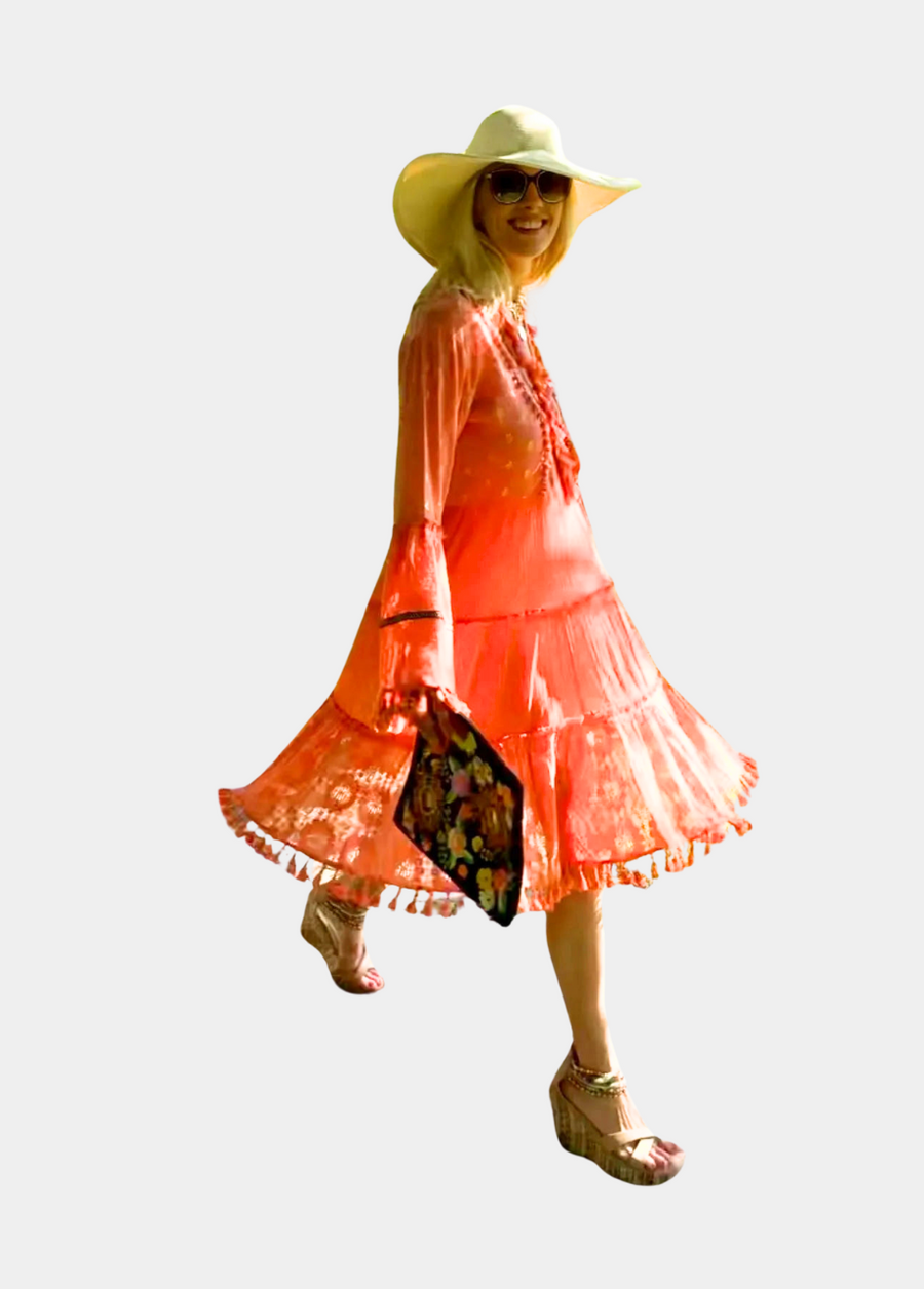 Indulge in the ultimate luxury with our Ibiza Long Midi Dress for Tall. Made with organic cotton, it features delicate lace and crepe with intricate details, including gold fleck, exotic trim, and tassels. Lightweight and 41" in length with long arm lengths, it exudes effortless chic, perfect for any occasion from garden soirées to beach weddings. Elevate your wardrobe with our chic and bohemian daytime elegance.