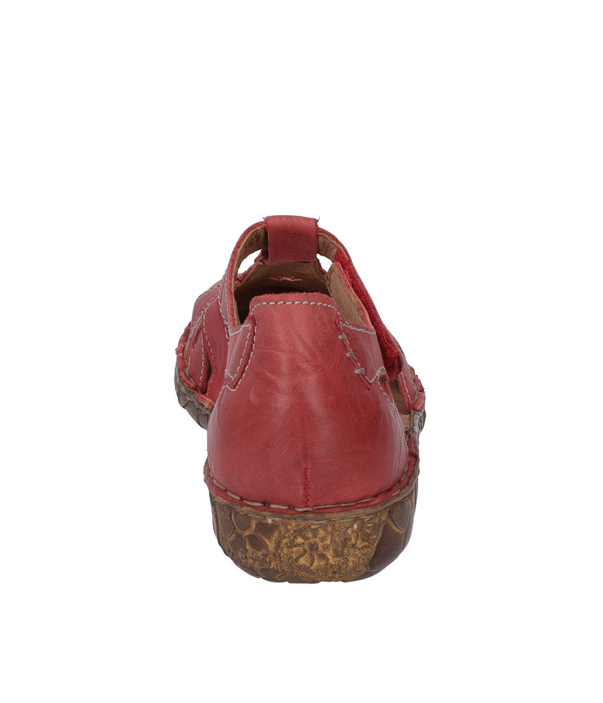 A Stylish Red leather lightweight closed toe sandal with cross strap design. Crafted from soft leathers with a cushioned leather lining, sitting atop a flexible and durable sole. Round toe sandal with an adjustable strap and hand stitched finish.