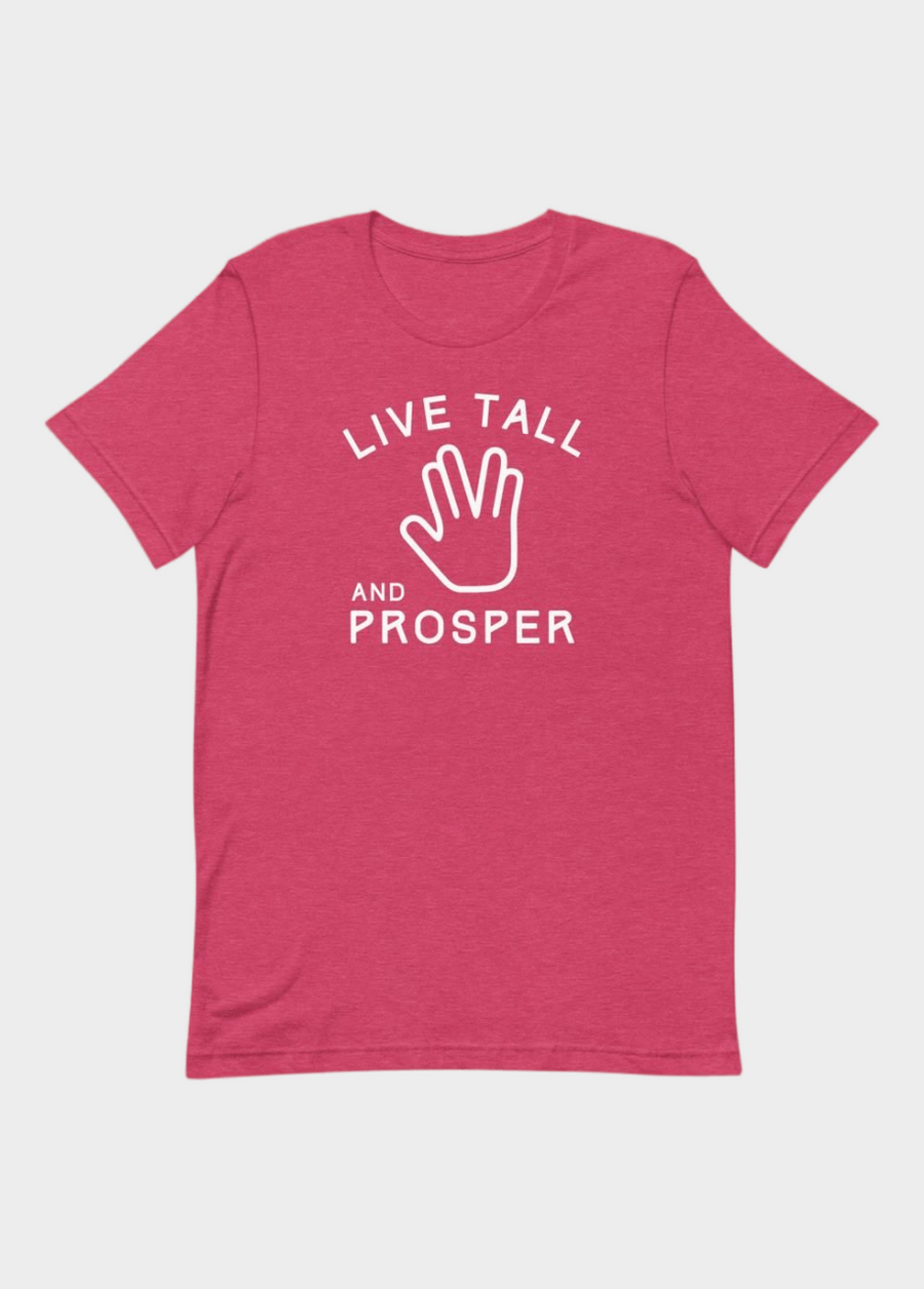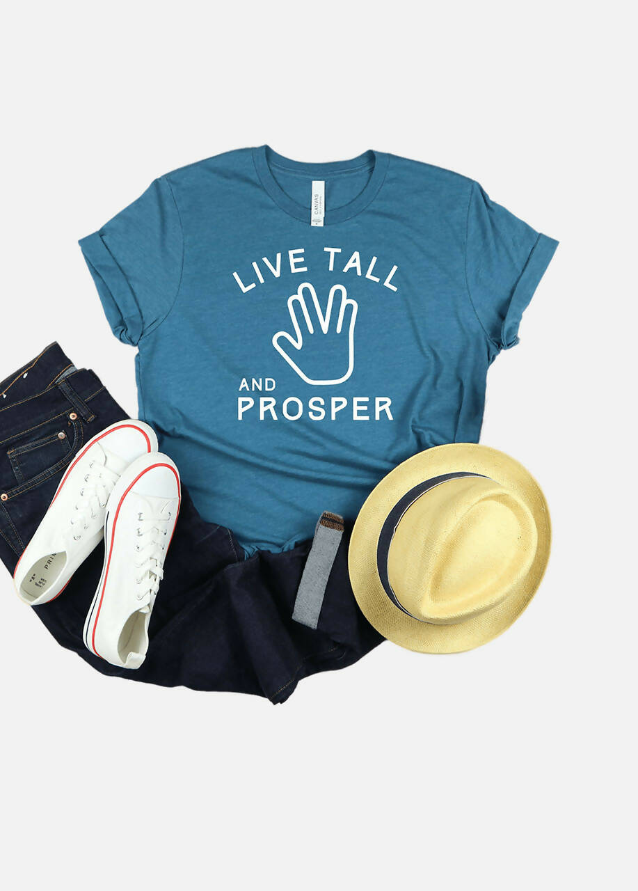 Perfect for any tall Trekkie fan, this Star Trek t-shirt puts a tall-inspired twist on the iconic Vulcan catchphrase, "live long and prosper". Featuring the famous Mr. Spock finger salute, you will proudly show your appreciation for the popular movie series every time you wear it. You'll likely even receive a Vulcan greeting from fellow Trekkie fans as they notice you wearing this fun and unique graphic tee!