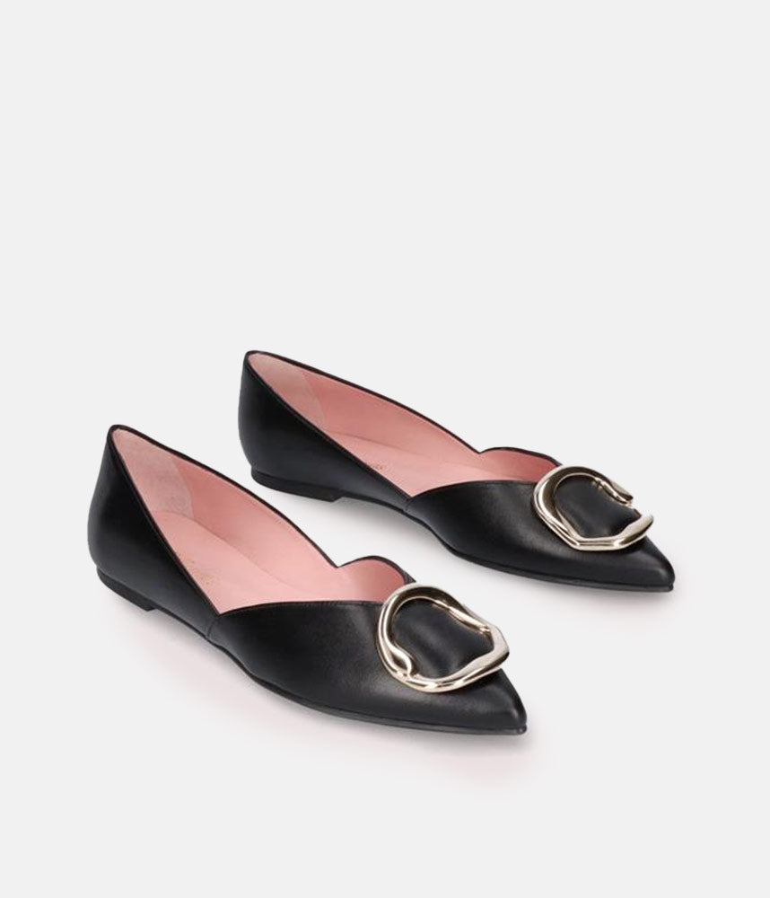 This Sophisticated Ballerina with a pointed toe comes in Black leather featuring a chrome embellishment on the vamp, with a flexible undersole and cushioned insole making them super comfortable to wear.