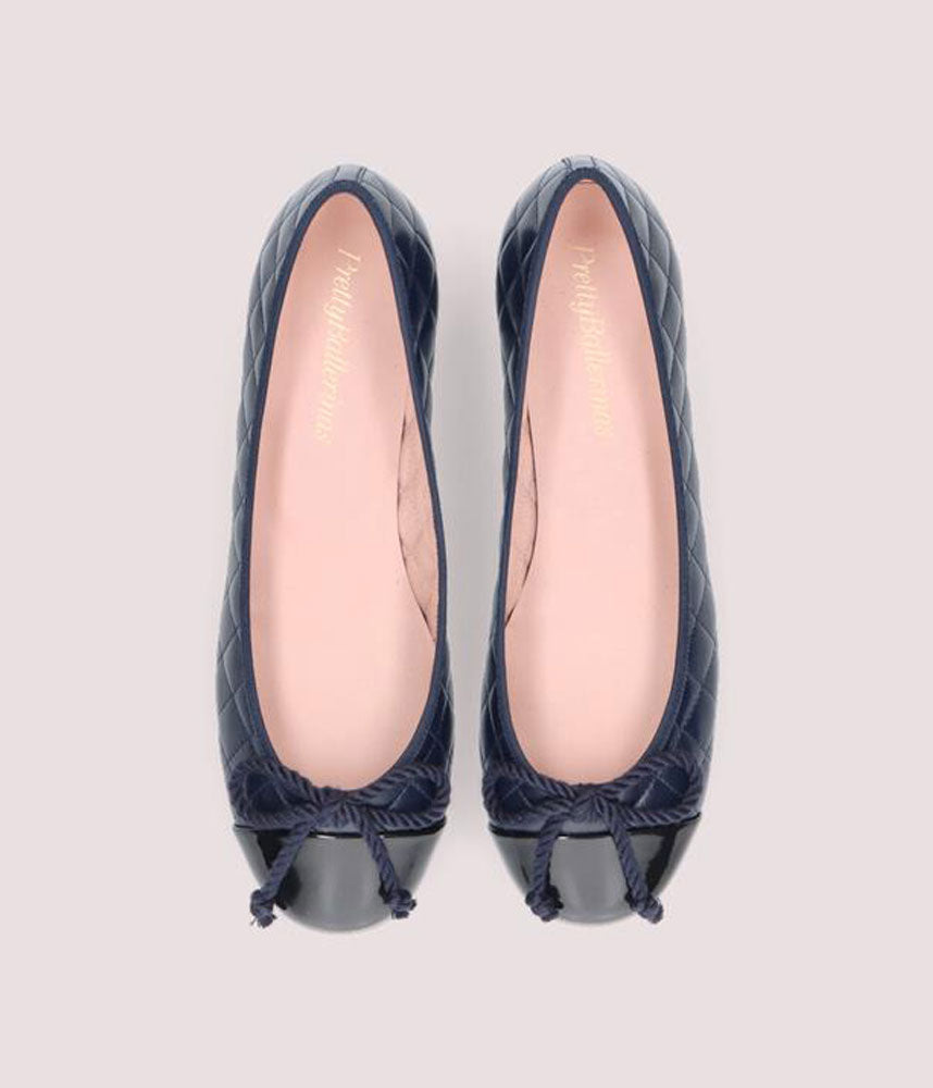 These Low Cut leather Ballerinas in Navy Quilted leather are so stylish, with a flexible undersole and cushioned insole making them super comfortable to wear. This style features a contrasting patent toe cap and a delicate Navy rope-bow.