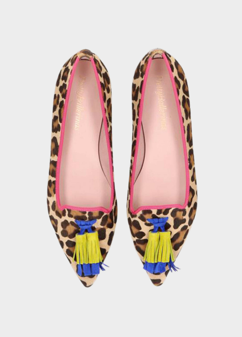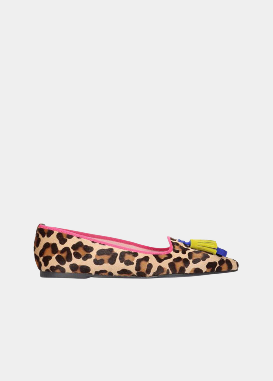 Add a pop of colour to your wardrobe this season in these Gorgeous Suede-embossed Leopard print pointed flats. Featuring a contrasting Pink trim and Suede Tassle, this style not only looks fasntastic but also has a flexible undersole and cushioned insole making them super comfortable to wear