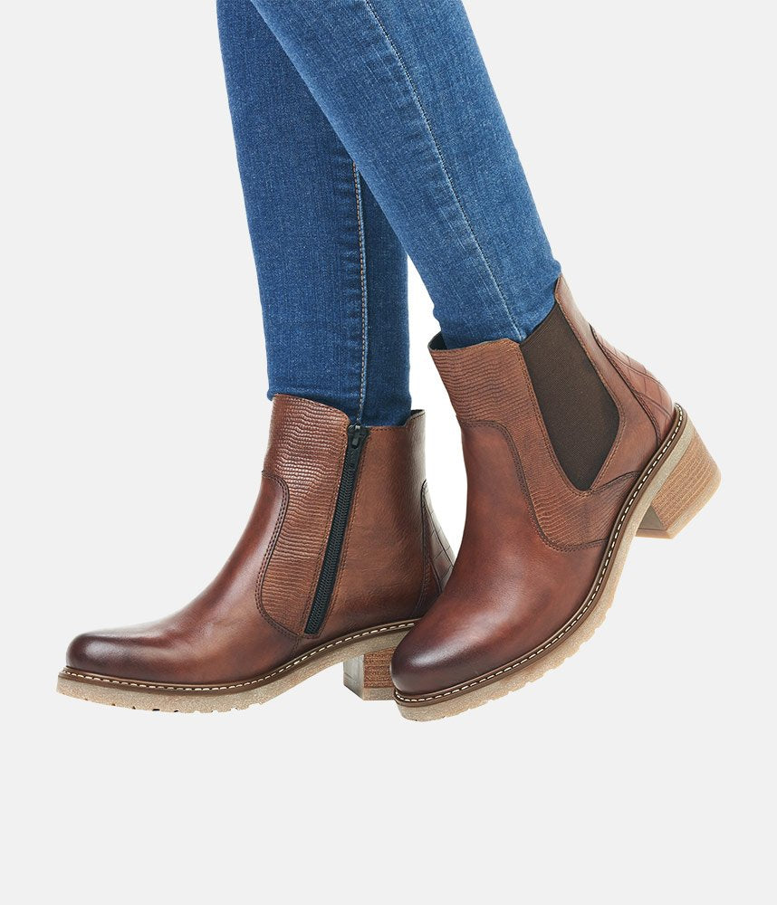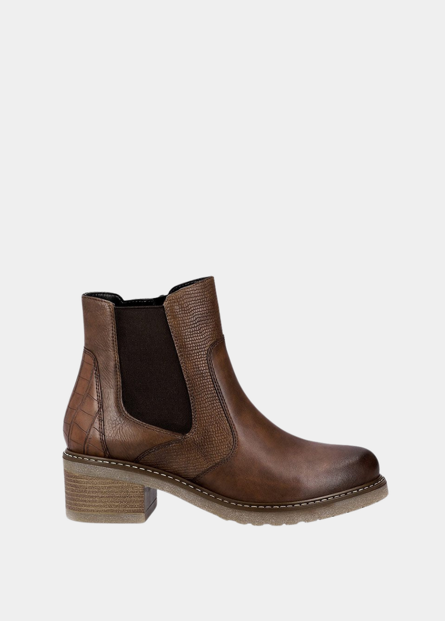 This is a great new style ankle boot from Remonte this season in a classic Brown leather with textured panelling and an elasticated side gusset to complete the look. With an inside zip for easy access and a soft textile lining.