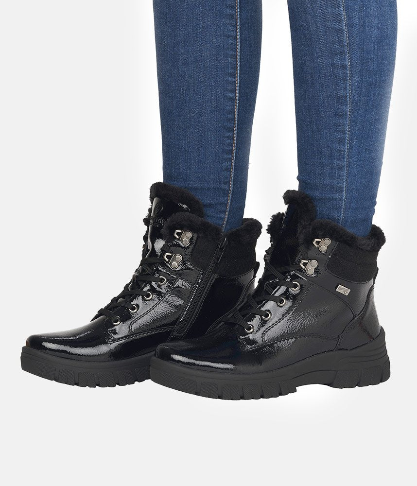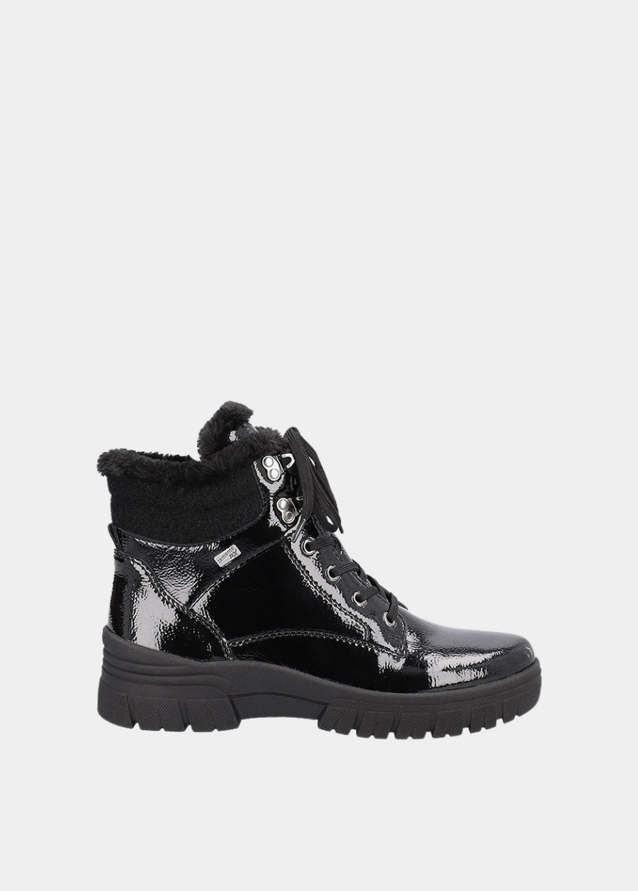 These New Style ankle boots from Remonte are a super choice for the colder months. A stylish looking boot with side zip, cosy wool collar, adjustable laces and Remonte Tex shower resistant Technology. These boots stand upon a chunky cleated sole that provides a practical grip and traction with every step and feature the highly water resistant RemonteTEX membrane, making them versatile for all conditions.