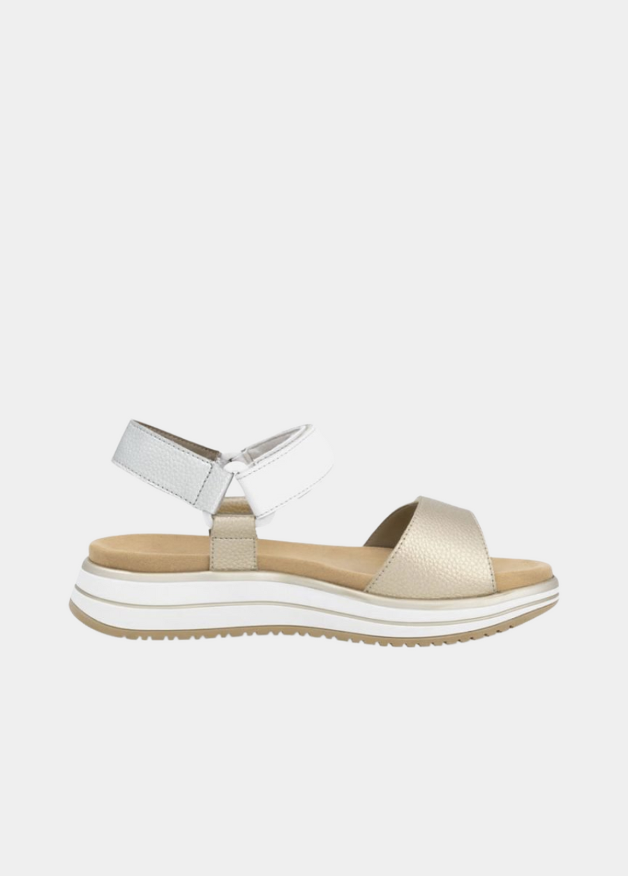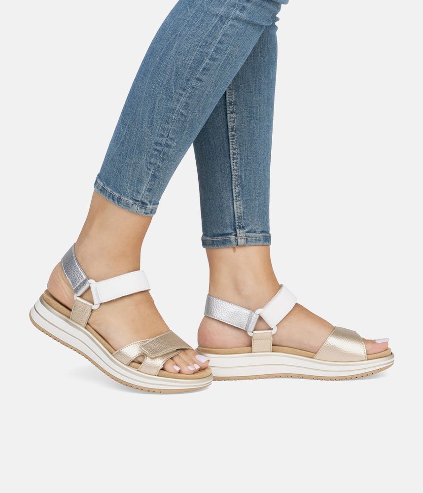 This is a Fabulous looking new style from Remonte featuring Velcro straps in Gold, Silver and white with a contrasting white outsole. Featuring a shock absorbing insole which is light and flexible. They are not just stylish, but practical for everyday use. Ideal to pack for a vacation to pair with just about any outfit from shorts to long dresses and Jeans.