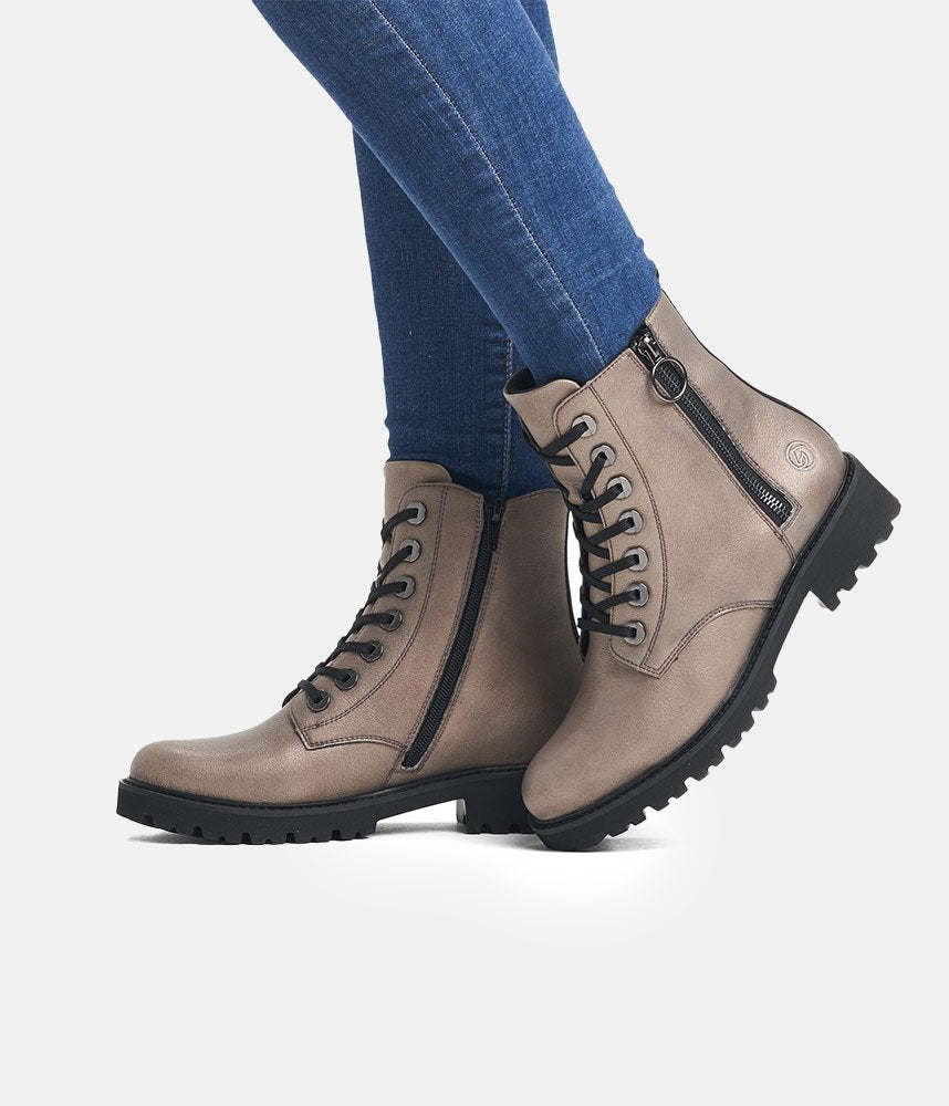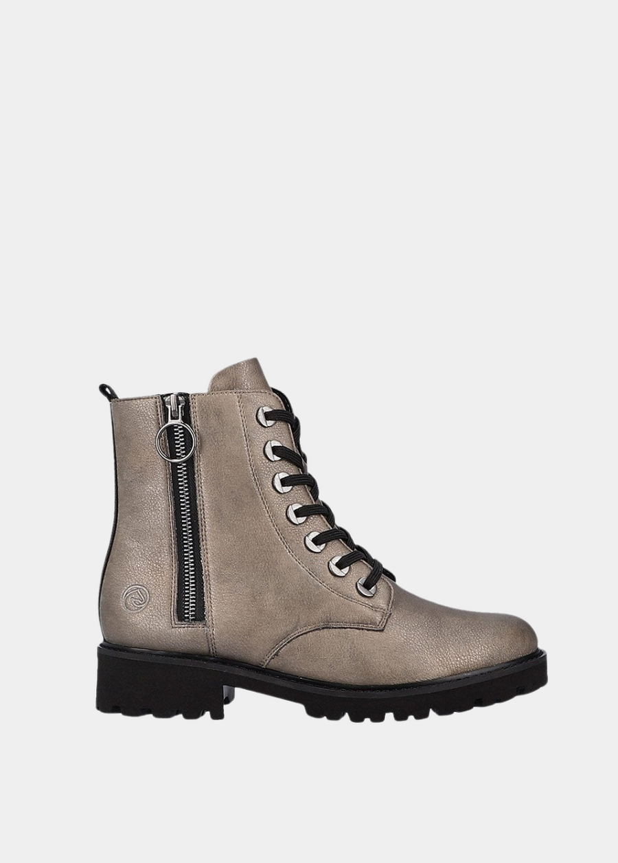 These chunky biker style boots from Remonte are perfect for your transitional wardrobe. Finished in a pretty metallic finish complete with black laces to the front and a functional zip for easy on and off. Featuring a black stripe to the back, chunky cleated rubber sole and lined with a soft fleece, ideal for keeping warm during the cooler months.