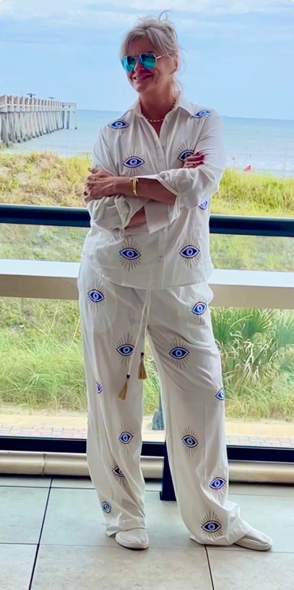Step into sophistication with our Sapphire Stare Pre-Washed Cotton 2 Piece Coordinate. This luxurious set, featuring mystical embroidered eyes, adds a touch of intrigue and serves as a ward against bad juju. Perfectly designed for tall women, this set seamlessly coordinates with other wardrobe staples, offering a sophisticated and exclusive look.