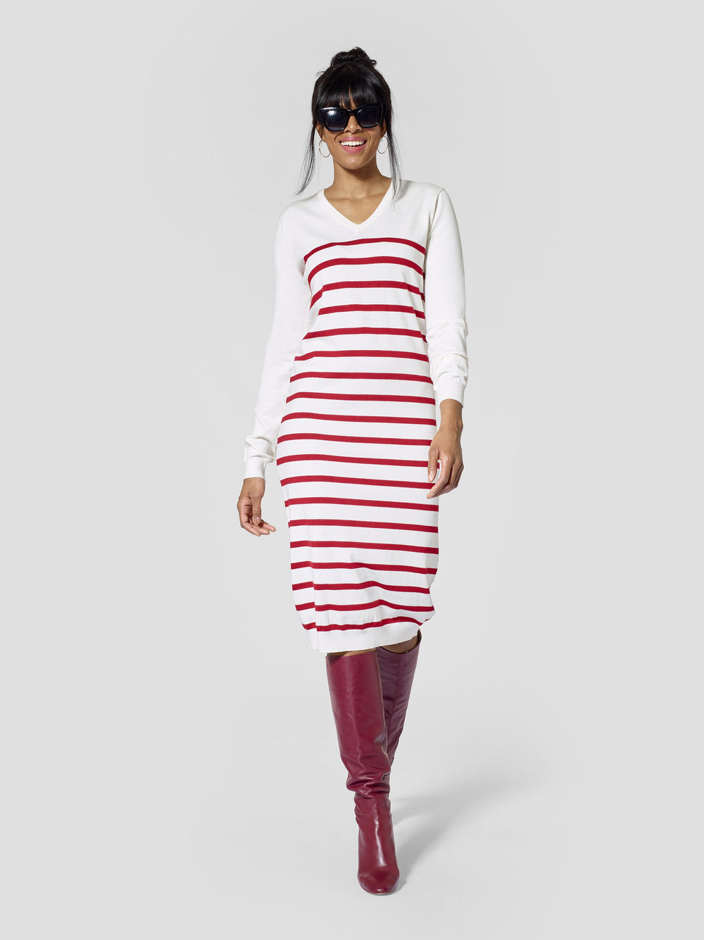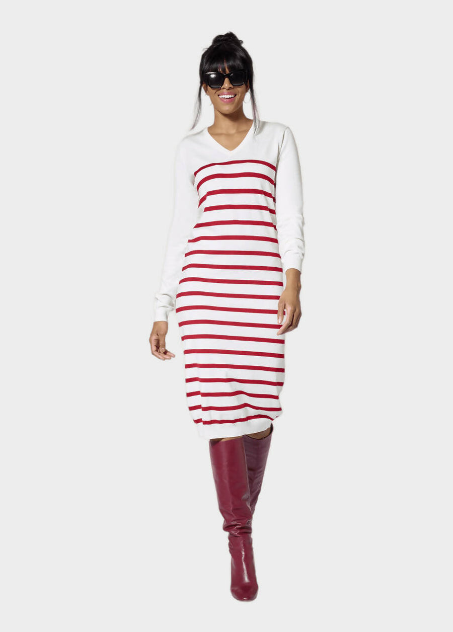 Elevate your everyday cold weather wardrobe with this chic and versatile tall sweater dress. Crafted in a cozy knit fabrication, it features a v-neckline with sporty striped details, a long silhouette designed for taller frames, and tonal black ribbed trim. Layer on your favorite cold-weather accessories to see how easily this piece can transition from one look to the next.
