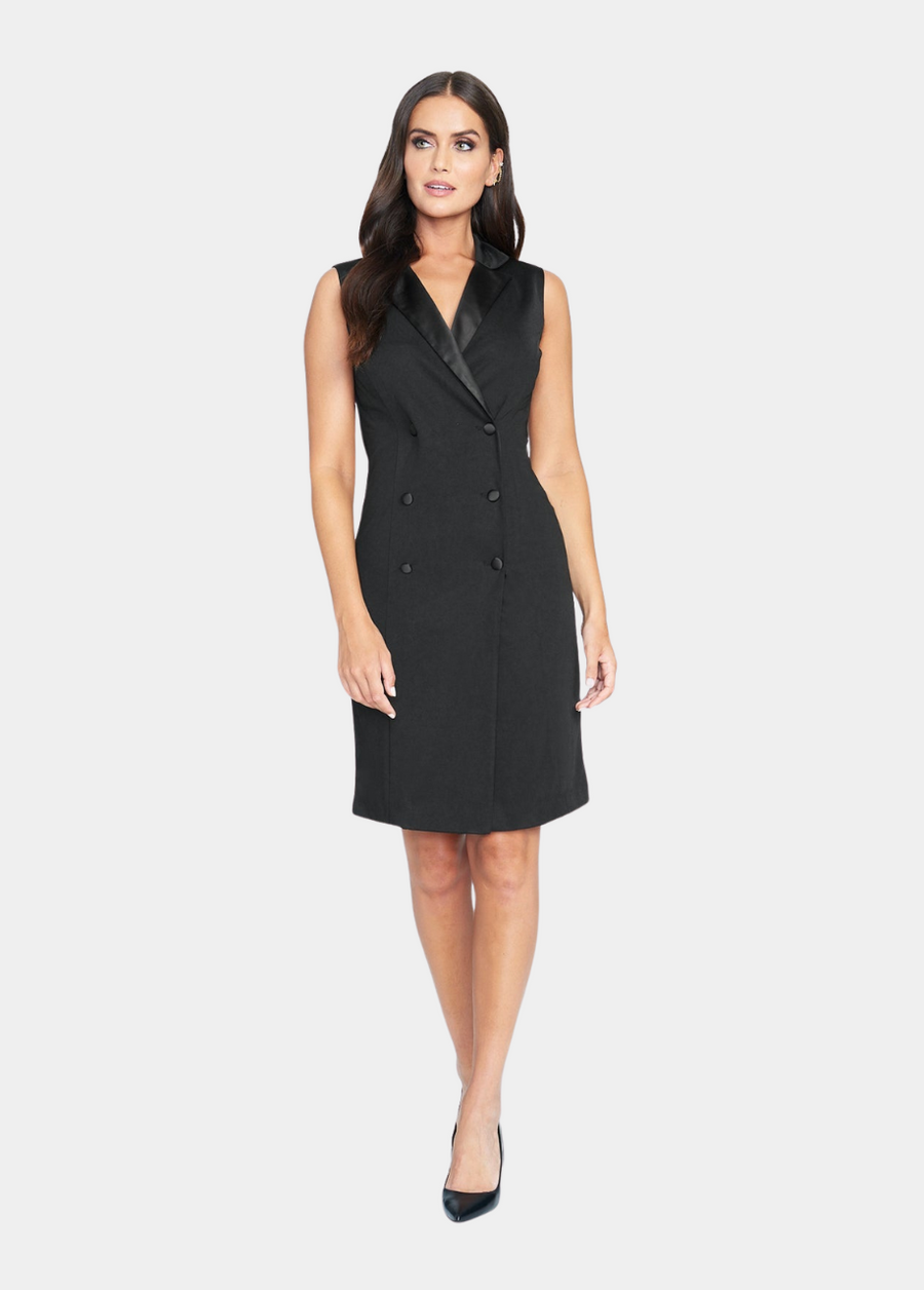 Contrast satin lapels add to the tuxedo-inspired look of this all-black dress that's perfect for your next cocktail party.