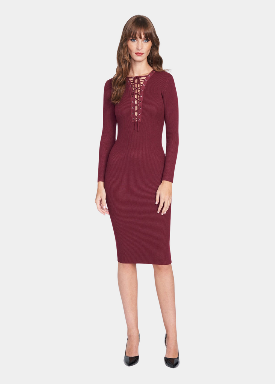 The Andria Knit Midi Dress features a plunging neckline with a lace-up front, grommets, long sleeves, and a figure hugging silhouette. A classic dress with a twist.