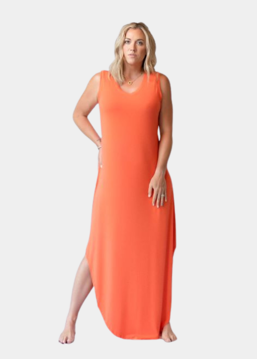This effortless elegance maxi dress is designed specifically for tall women. It has a flattering v-neck and side split to the knee. Crafted from soft modal and spandex for a luxurious feel, it is great for the beach and hot summer days. Available in two lengths, the "Breezy Sands Maxi Dress" provides the comfort and style for tall women.