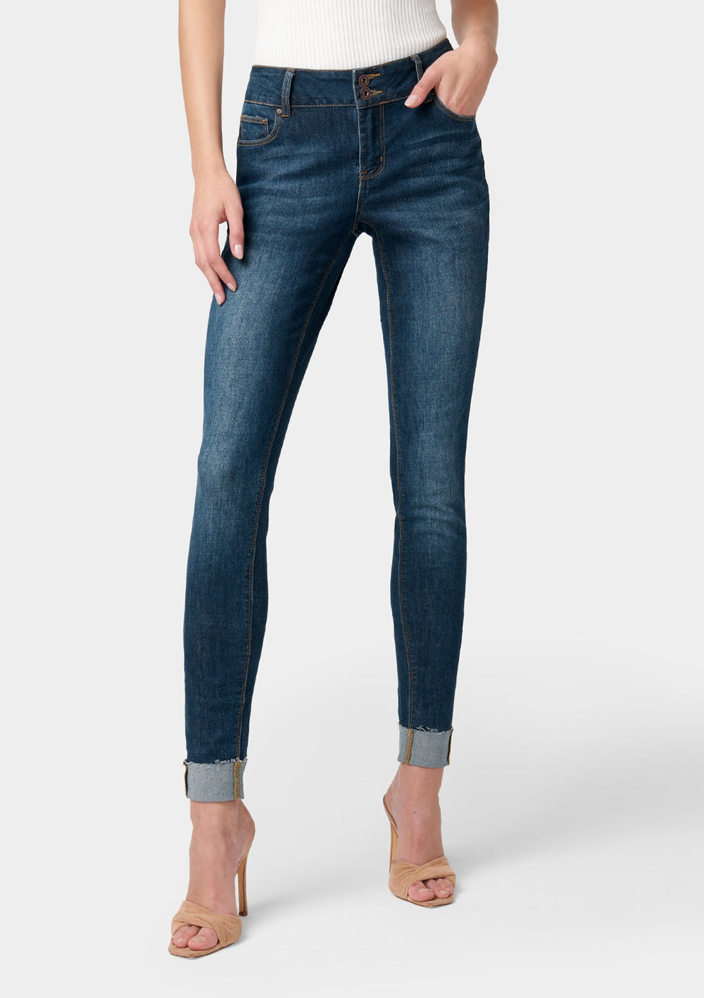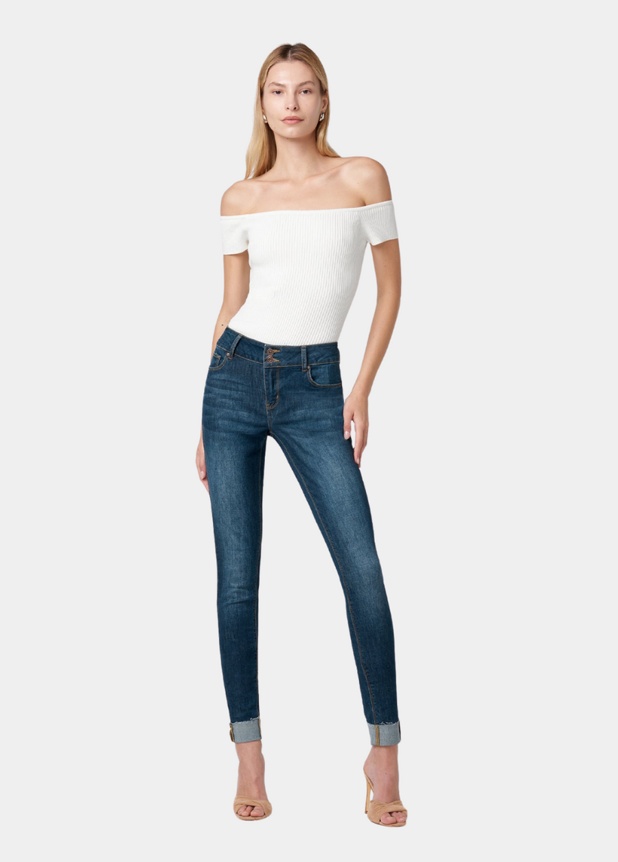 A faded wash and raw cuffed hems bring a laid-back character to these mid-rise skinny jeans. The Brianna also features a two-button and zipper closure, perfect for an everyday look!