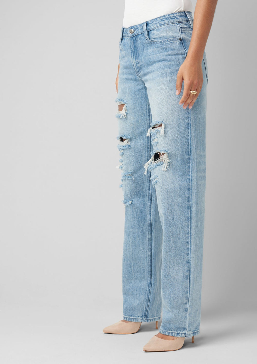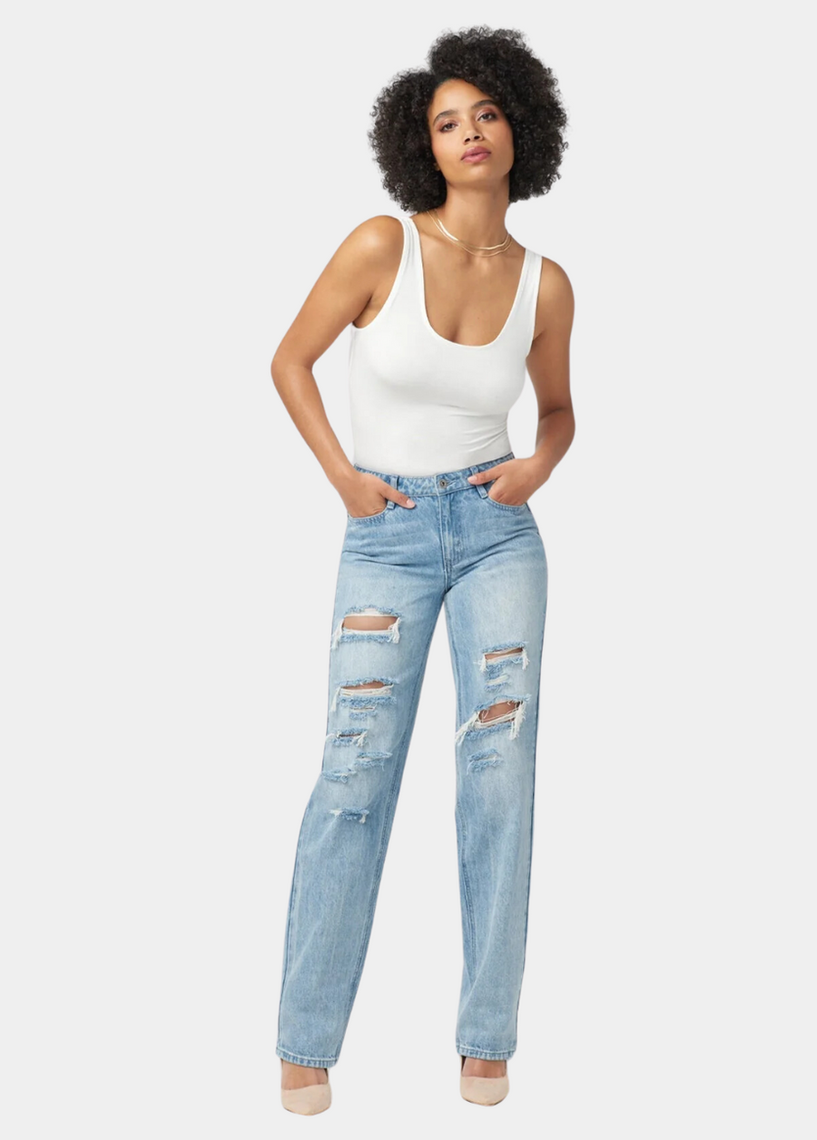 A pared-back version of the boyfriend style, The Cali girlfriend Jean feature a slimmer fit that relaxes through hip and thigh! These distressed jeans have full-length legs that can be cuffed to complete the look with casual polish.
