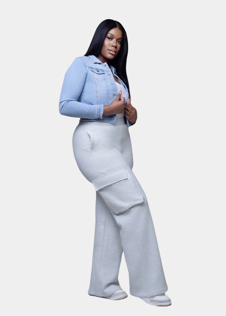 Designed for the tall woman who values both comfort and style, these grey wide-leg cargo sweatpants are the ultimate everyday essential.