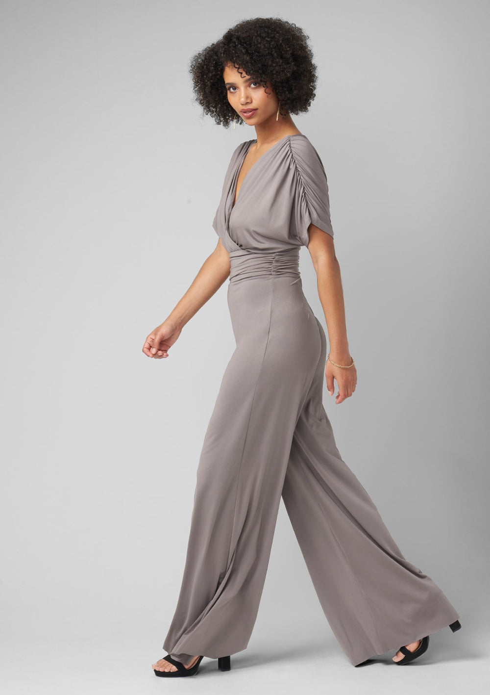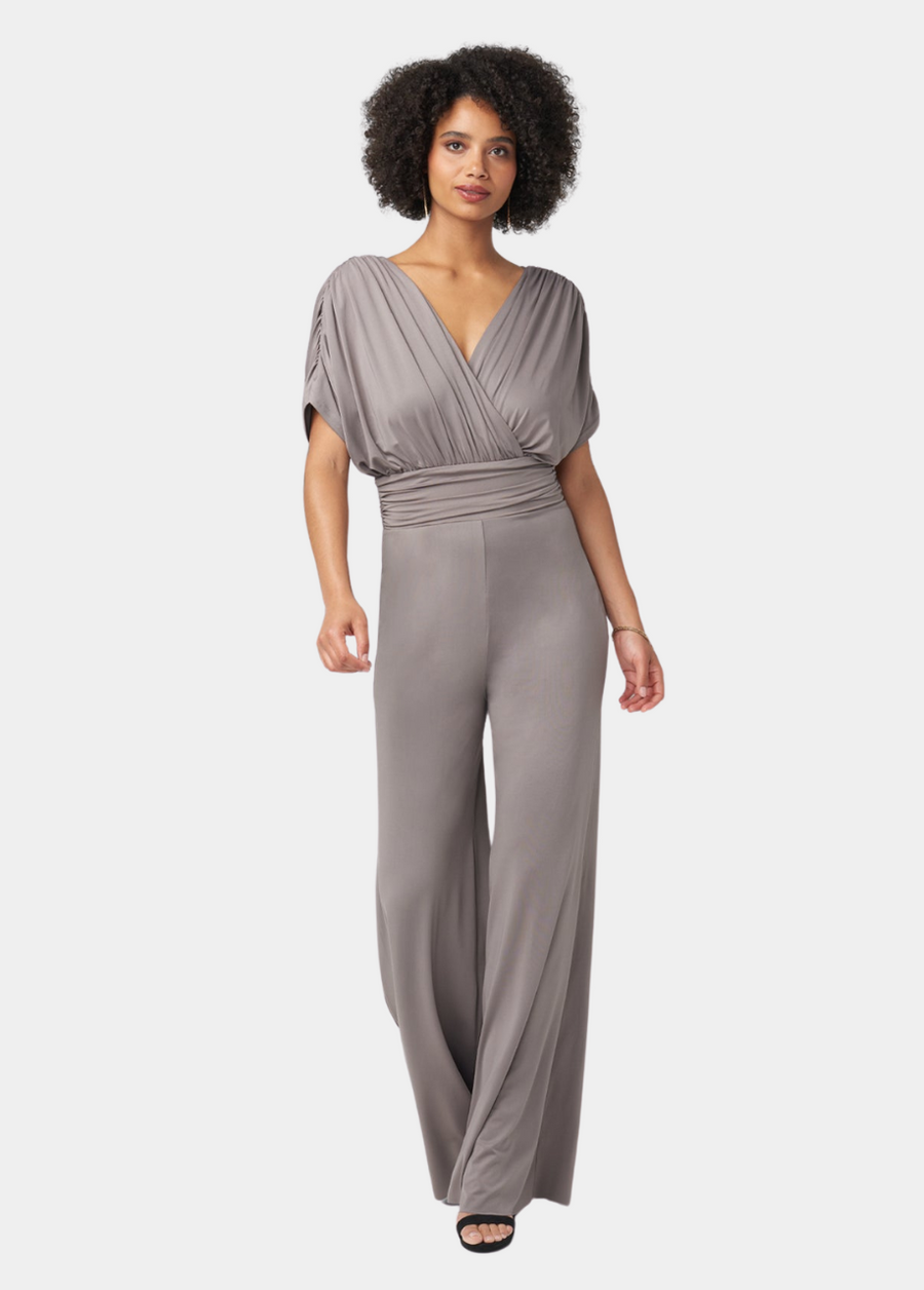 Introducing the Hampton Jumpsuit, a stunning piece that is sure to turn heads at any event. Made from a slinky buttery fabric, this jumpsuit drapes beautifully on the body and feels luxurious to wear. This jumpsuit features beautiful rouching on the shoulders and sleeves, adding a touch of elegance and sophistication. The surplice neckline creates a flattering shape that accentuates the bust, while the cinched waist cinches in at the smallest point of the waist for a feminine silhouette. The v-cut back with tie detail and hidden zipper adds a touch of allure, while the wide flowy hems create a beautiful and effortless flow as you move. Perfect for formal occasions.