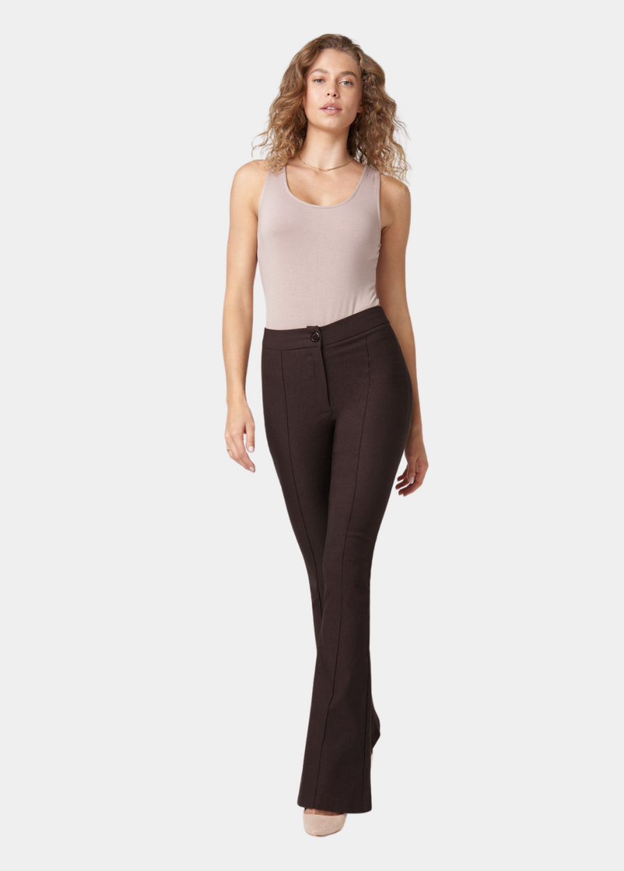 The High Waist Flare Pant is our latest style addition to our stretch dress pant collection. For added style this tall pant features a wide flare leg and a subtle full front pin tuck detail. This dressy pant is designed to support and flatter your waistline and hips while keeping its shape.