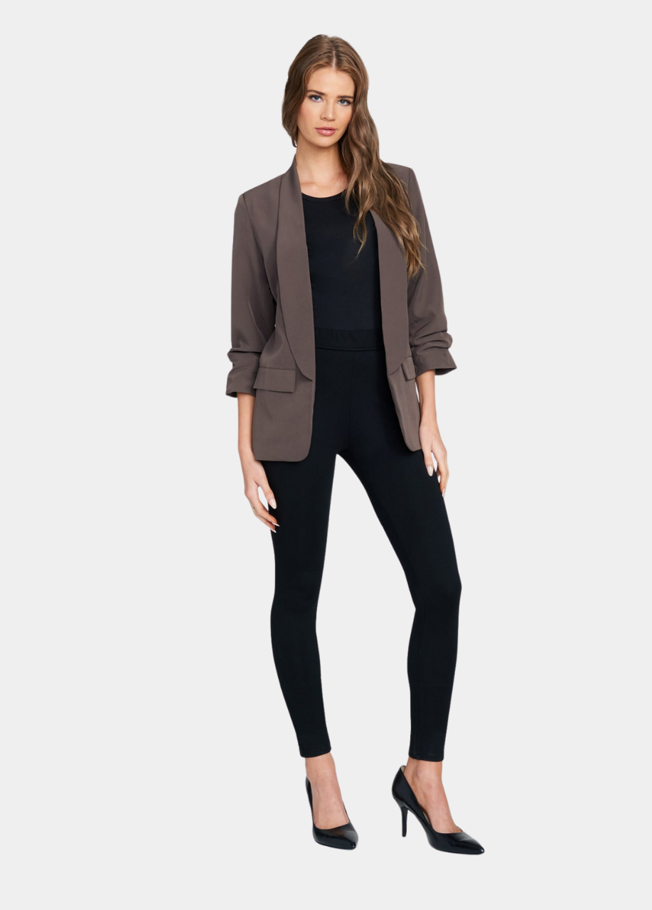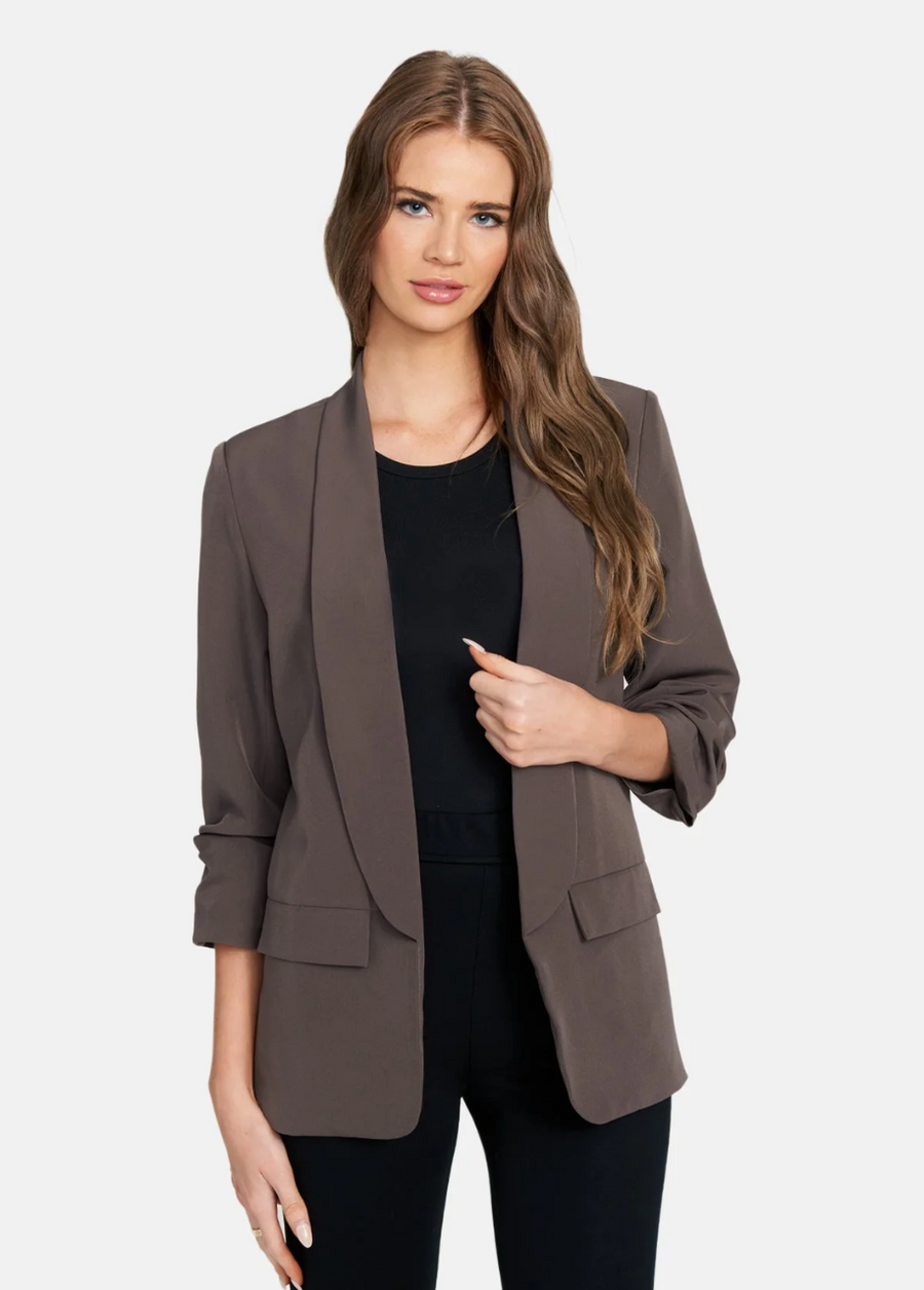 A season-less silhouette. The Katherine blazer features an open front design, faux front pockets, scrunched ¾ sleeves, and a lightweight fabric giving you the perfect balance of softness and structure.