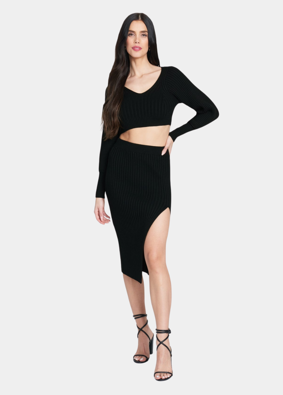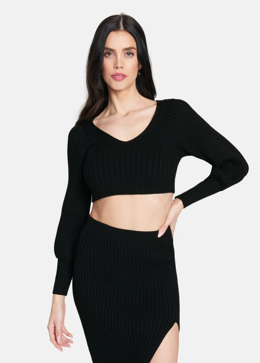 Bring an on-trend monochromatic style to your wardrobe with this beautiful rib-knit top. The Kaylee top features a cropped silhouette, v-cut neckline, and a slight blouson sleeve. Pair it with the Kaylee Knit Skirt for a polished look!